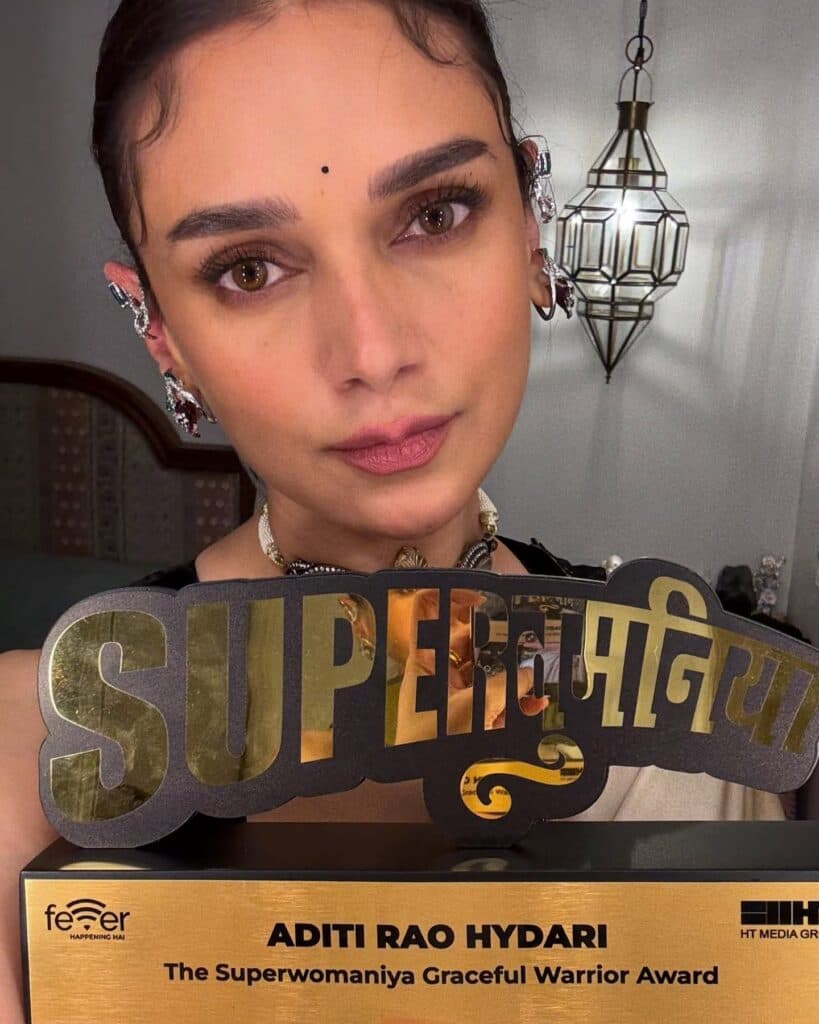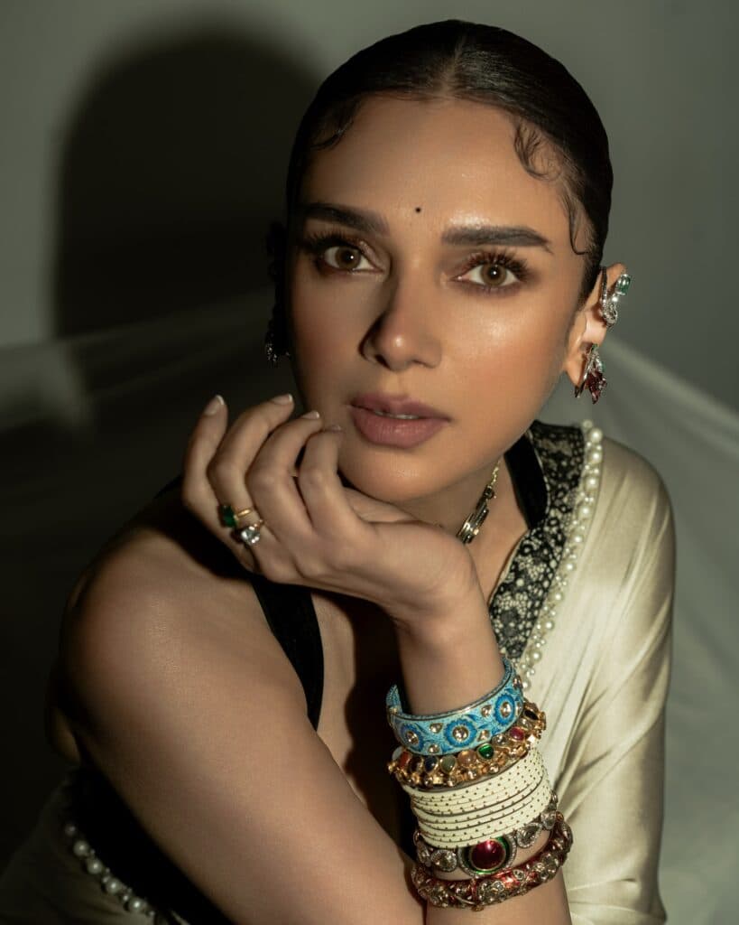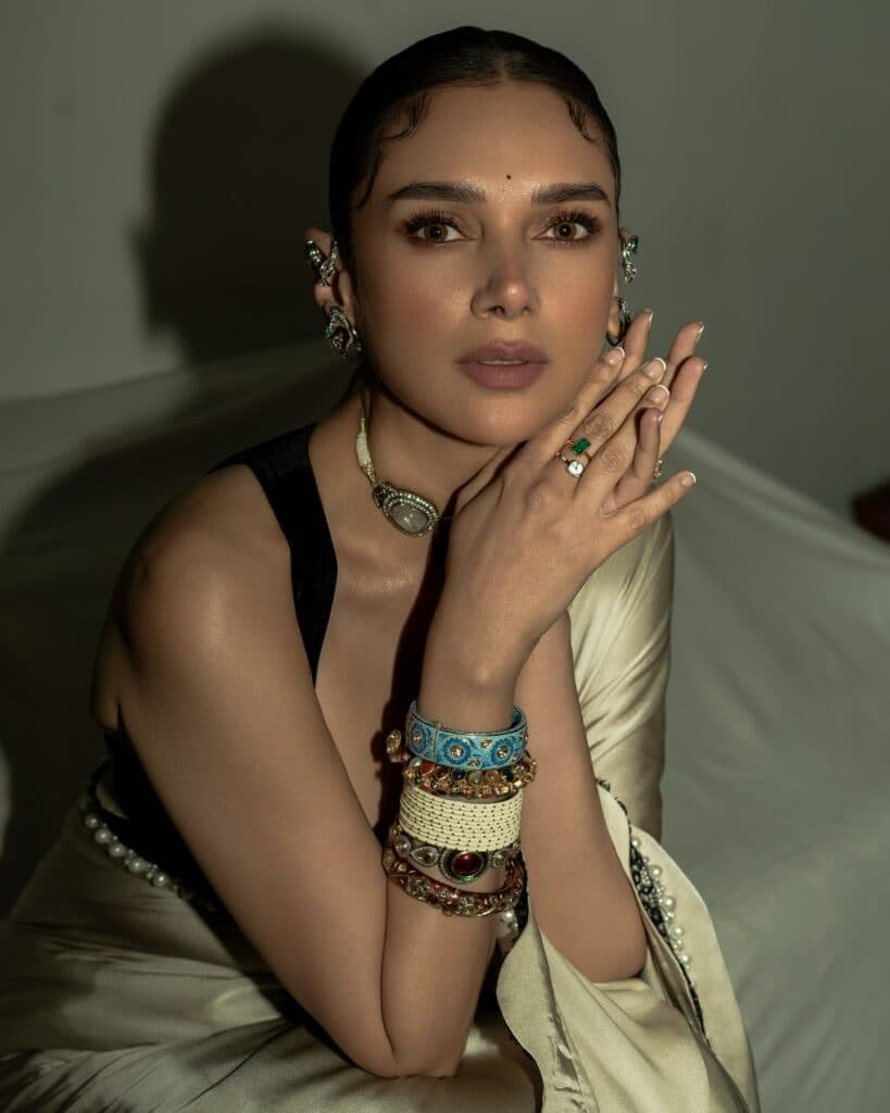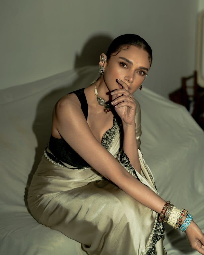 Even though Aditi Rao Hydari has only appeared in four Telugu films Maha Samudram, V, Antariksham 9000 KMPH, and Sammohanam she still has a sizable following in Tollywood. The others gave mediocre performances, but her debut film, Sammohanam, was a memorable hit. She has been working on a variety of projects in addition to Telugu, including music videos and OTT hits like Heeramandi. She gained notoriety recently after being honored with the Superwomaniya Graceful Warrior Award. Aditi looked stunning in a silky saree, a deep black blouse, a tidy bun, and a bold choker that provided a touch of drama. Her timeless charm was accentuated by her serene demeanor and sparse makeup application. She is currently working on the English film Lioness and the Hindi film Parivarak Manu Ranjan.