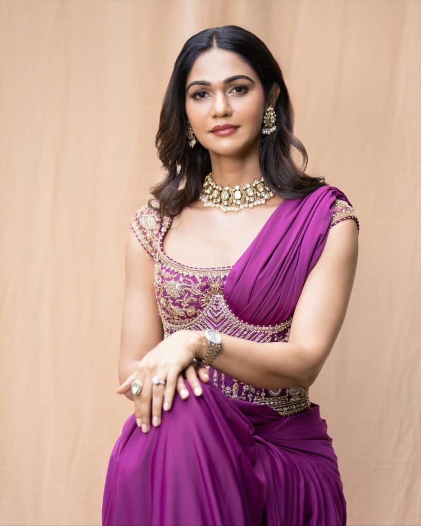 Sneha looked radiant in a deep purple saree-style gown adorned with gold embroidery, complemented by a choker necklace and soft waves that framed her smile perfectly. Allu Arjun, on the other hand, looked effortlessly regal in a white embroidered sherwani paired with a strand of green beads — a perfect balance of simplicity and royalty.