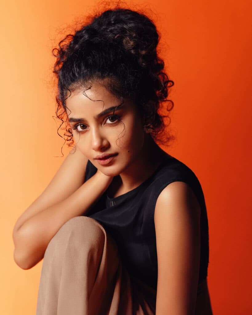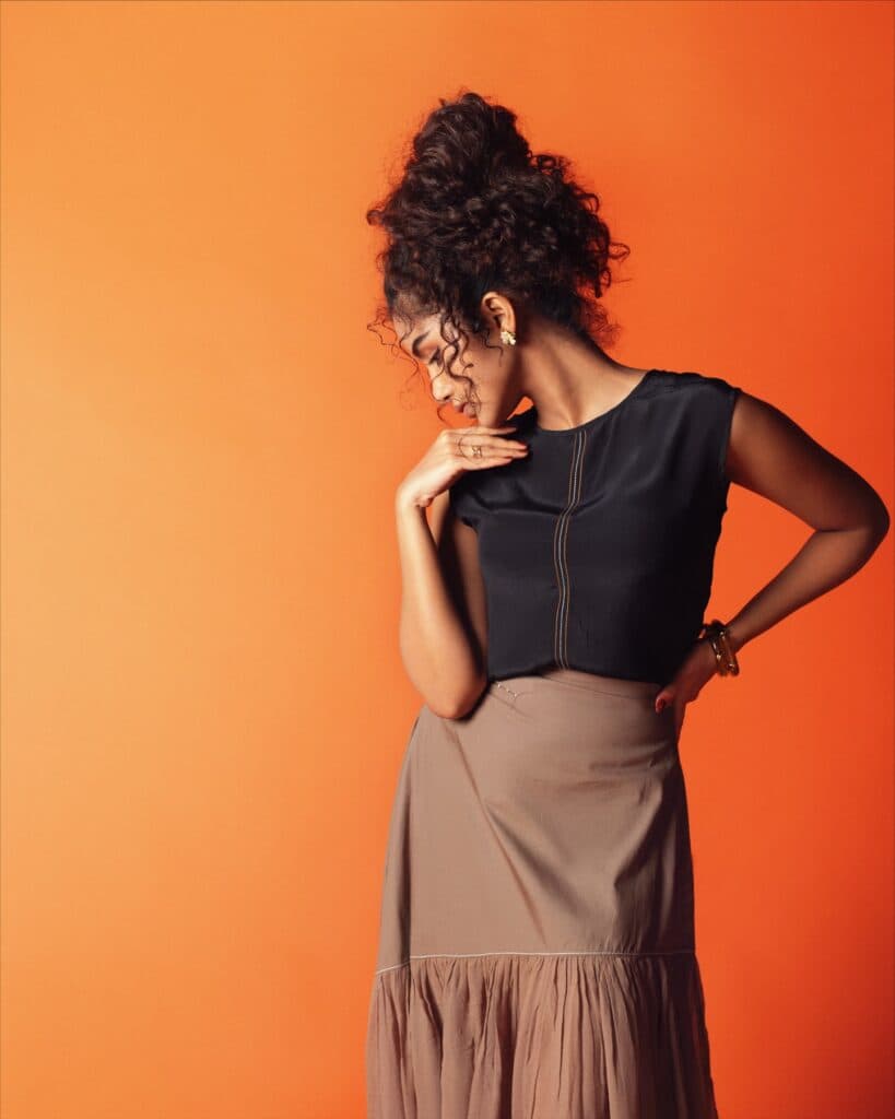 She talked about her 2016 Tollywood debut with A Aa and acknowledged that she was afraid at the time, but that was all changed by the Telugu audience's love. Her latest images, which feature a simple black top, a brown skirt, and curly hair tied up against a vivid orange background that creates a cozy, organic atmosphere, are also trending. In terms of her career, she has more releases coming up, such as the Tamil movie Lockdown on December 5.