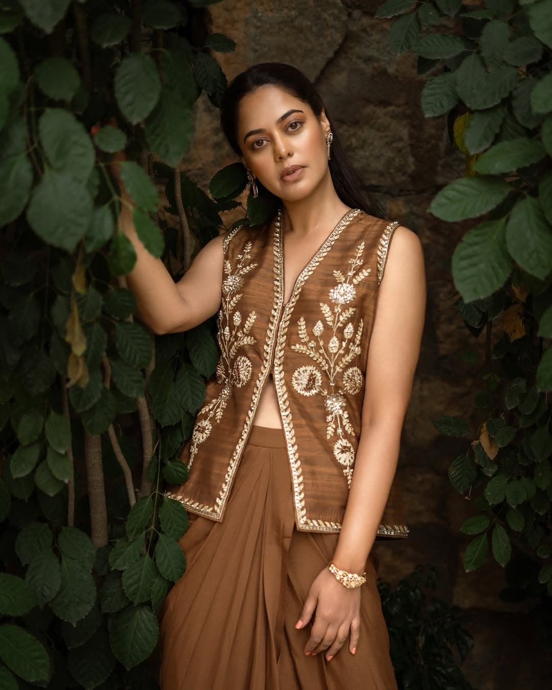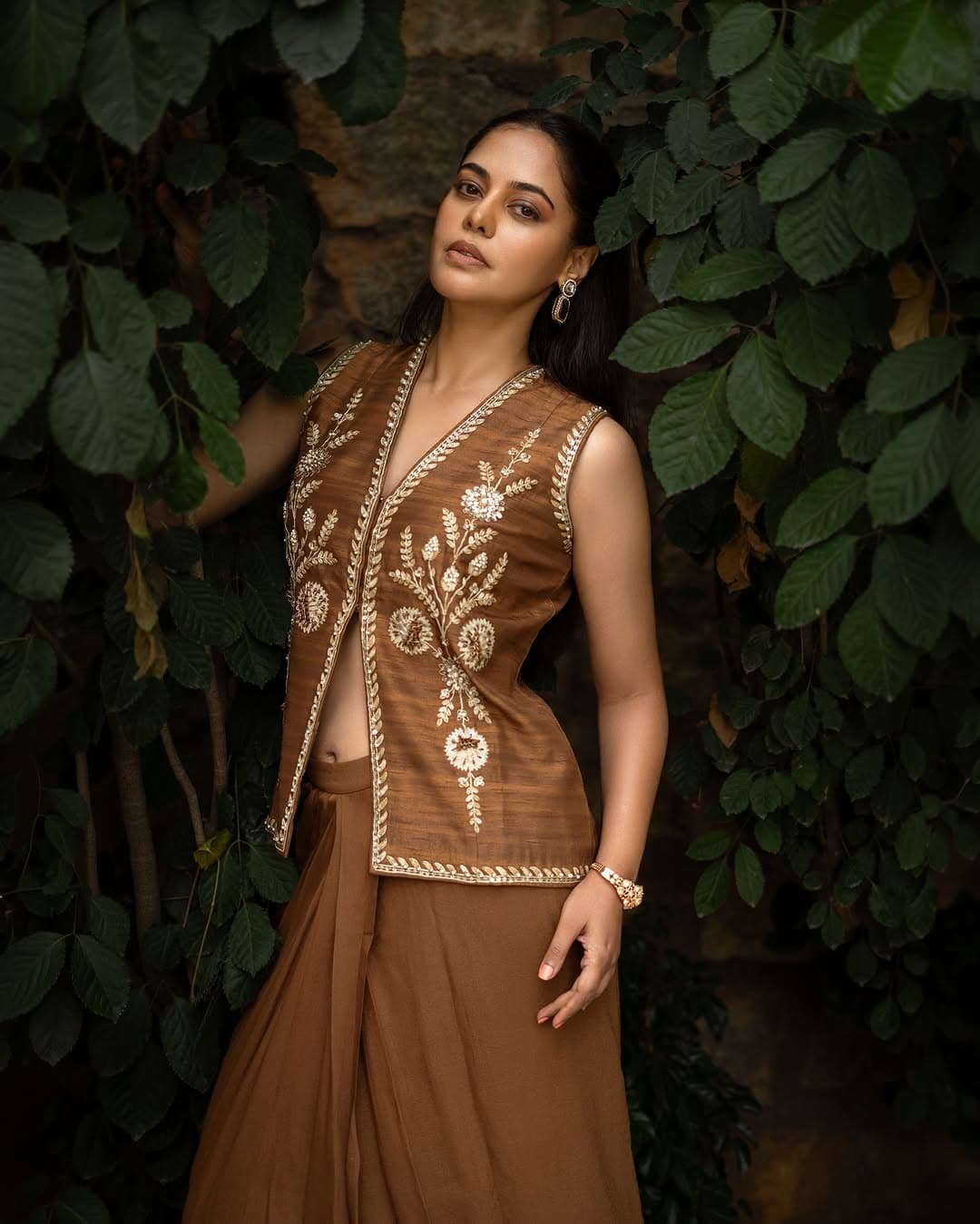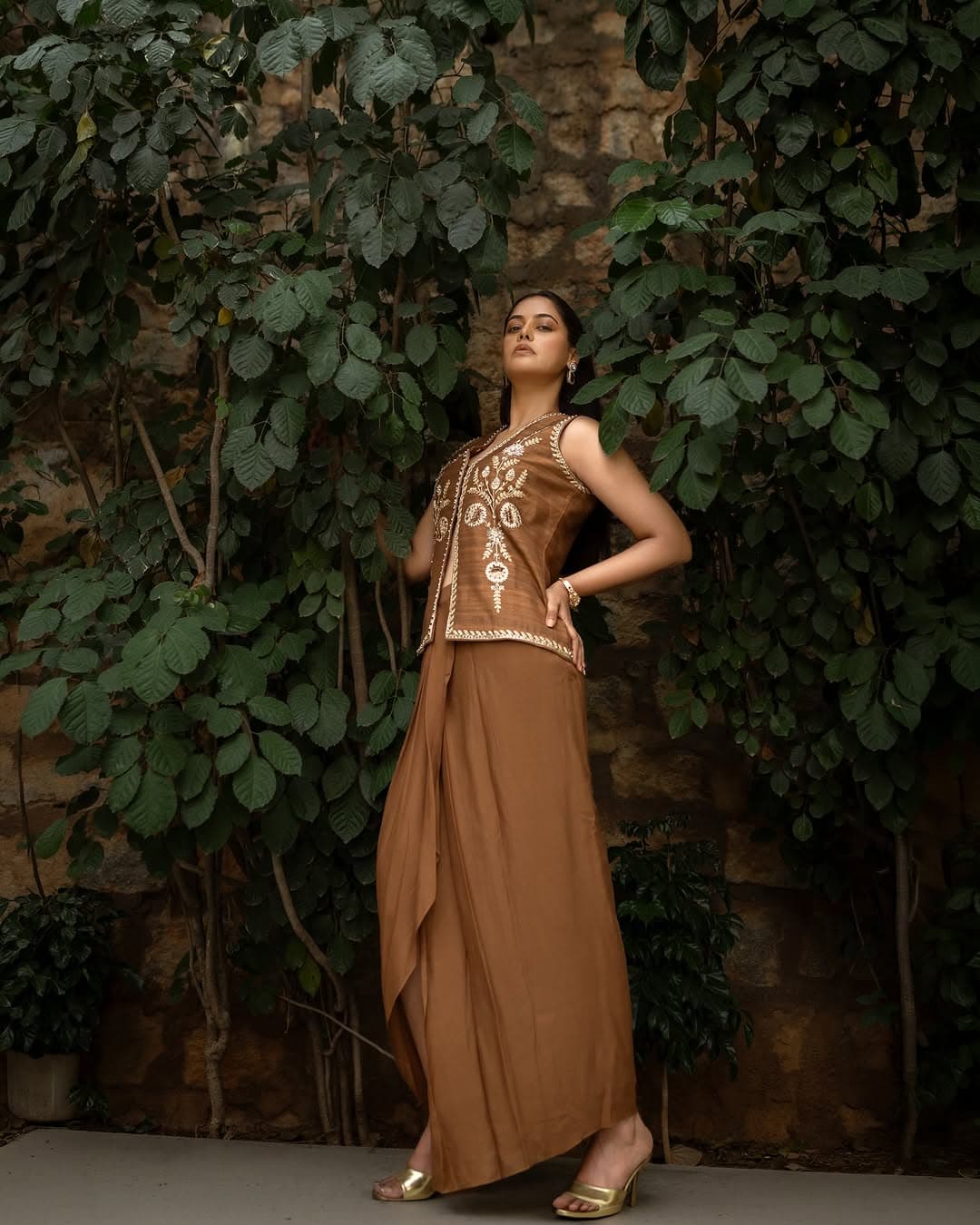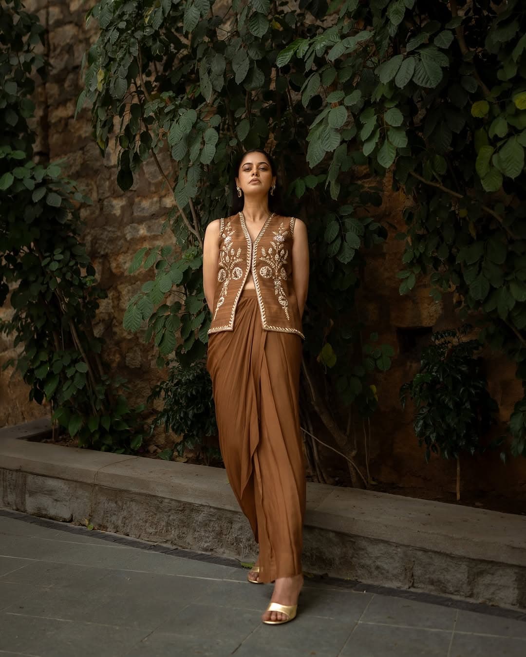Bindu Madhavi exudes grace and confidence in a rich earthy-toned ensemble, blending effortlessly with nature’s backdrop.Her minimal styling and poised expressions elevate the look into a perfect mix of elegance and serenity.