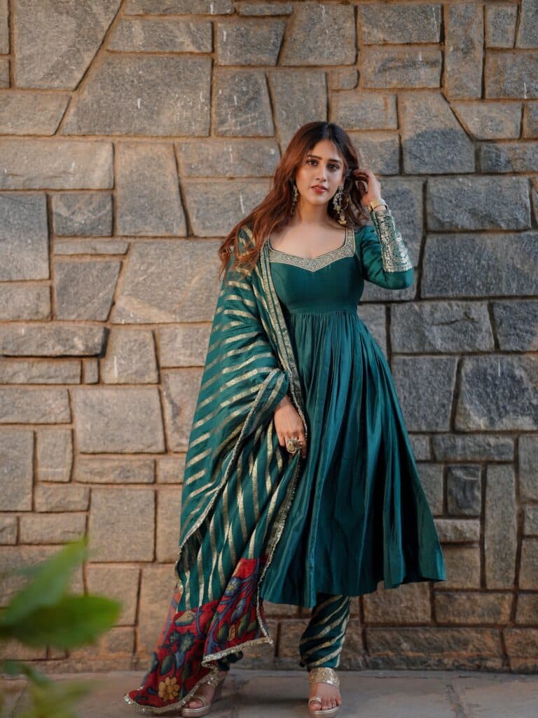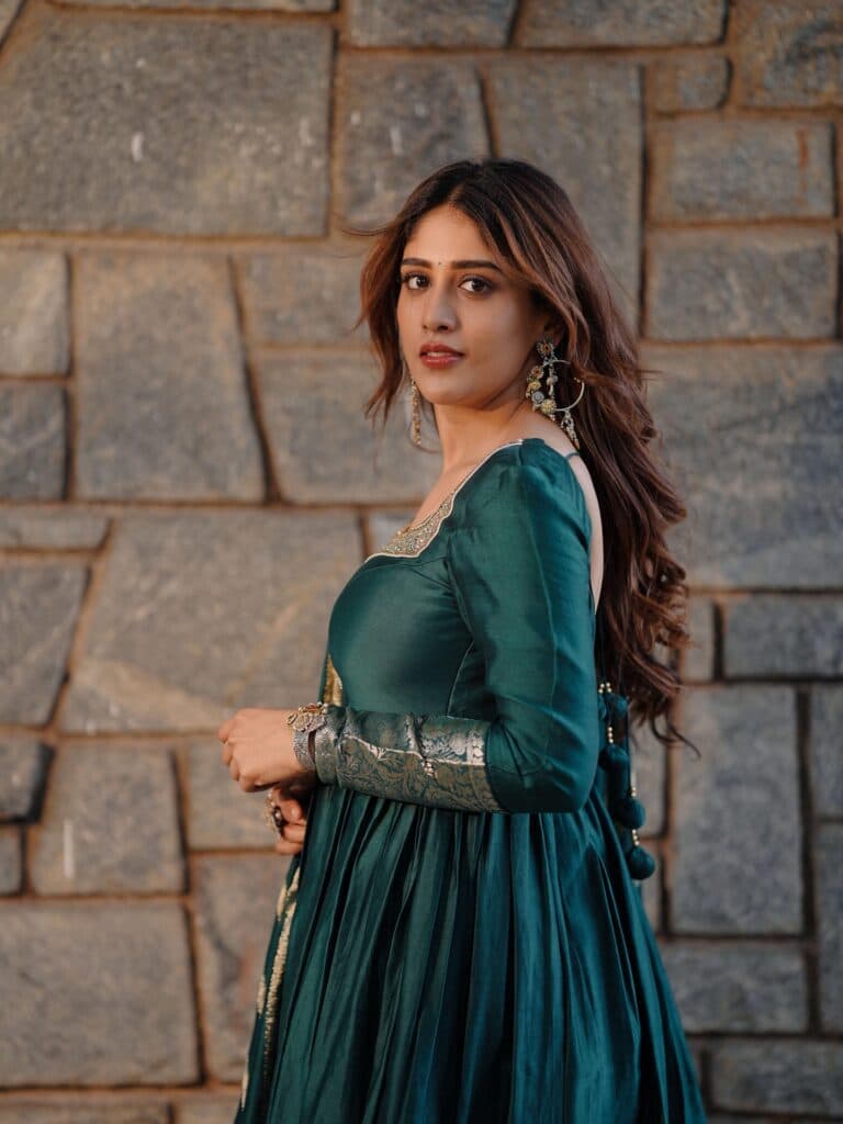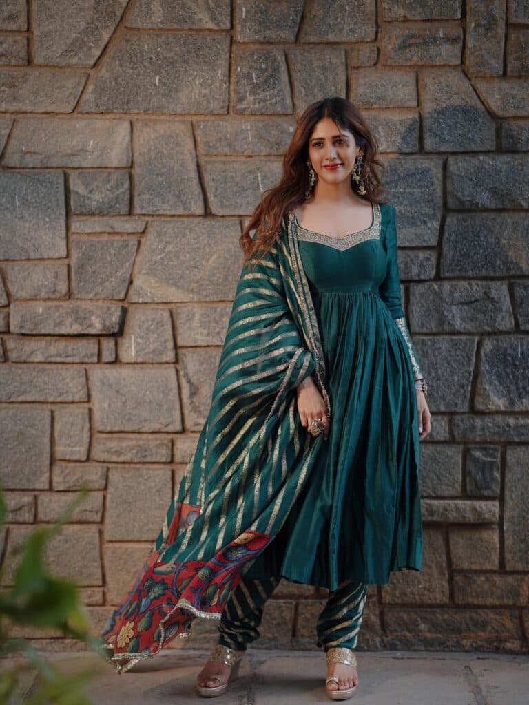 Chandini Chowdary continues to charm effortlessly, radiating calm elegance in her latest photos. After a short yet memorable role as Shivani in Daaku Maharaj, she’s now gearing up for her next film, Santhana Prapthirasthu, releasing on November 14. To promote it, Chandini shared a few stunning pictures that quickly went viral among fans. Dressed in a deep green outfit with striped pants and a printed dupatta, she looked graceful and understated, with gold jhumkas and a soft smile adding to her charm. Her look blends festive warmth with simplicity, reflecting her natural style. The upcoming film, Santhana Prapthirasthu, is said to be an emotional family drama centered on infertility and relationships.