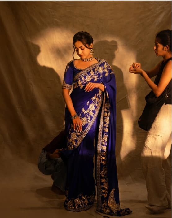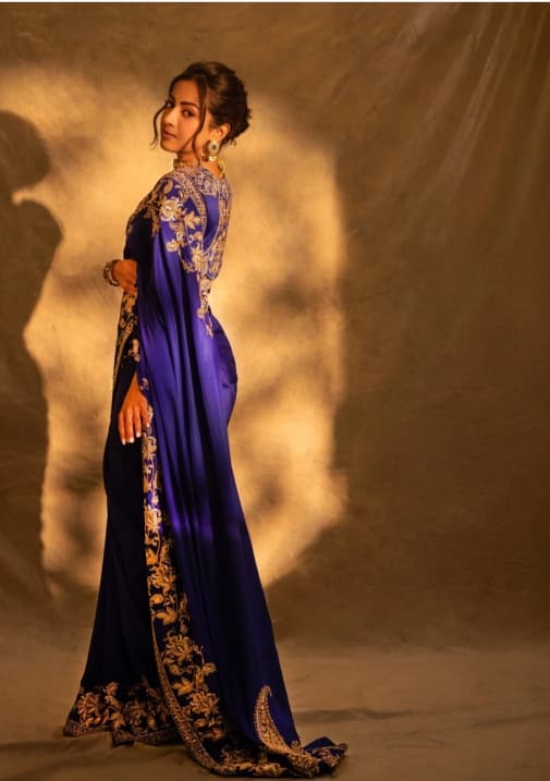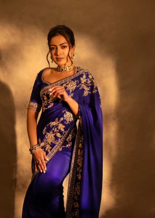 With her most recent photo shoot, actress Catherine Tresa, who is renowned for her grace and commanding on-screen persona in movies like Paisa, Sarrainodu, and Godfather, once again attracted attention on social media. The actress, dressed in a royal blue saree with elaborate golden embroidery, radiated poise and elegance in every picture. Catherine's classic style was enhanced by bold jewelry and a calm, assured demeanor that perfectly encapsulated her timeless charm.