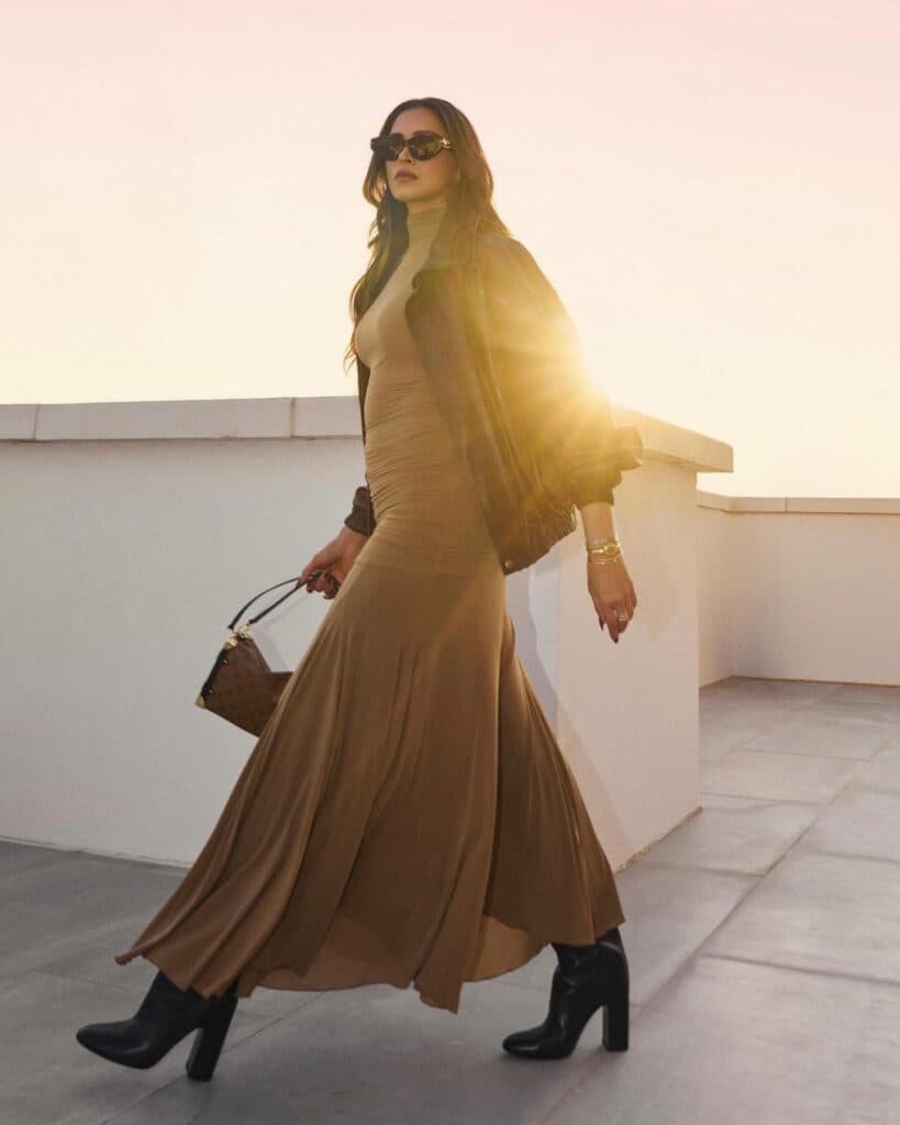 Deepika Padukone, while working on her sci-fi film with Allu Arjun, appeared at the Abu Dhabi Grand Prix looking effortlessly stylish. She wore a smooth-flowing Magda Butrym high-neck maxi dress paired with a rugged leather aviator jacket, creating a perfect mix of soft elegance and chic edge.