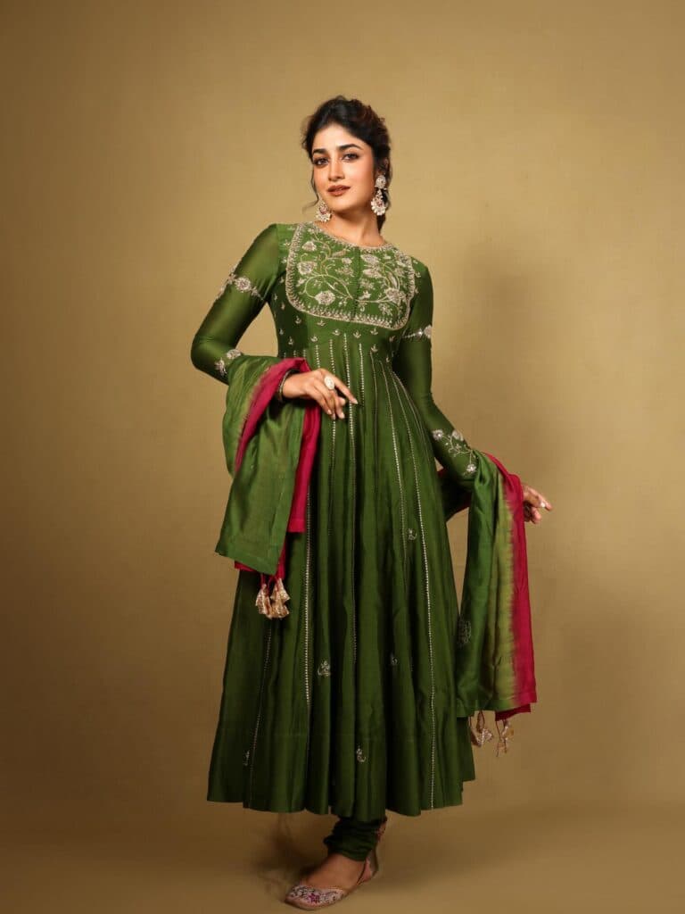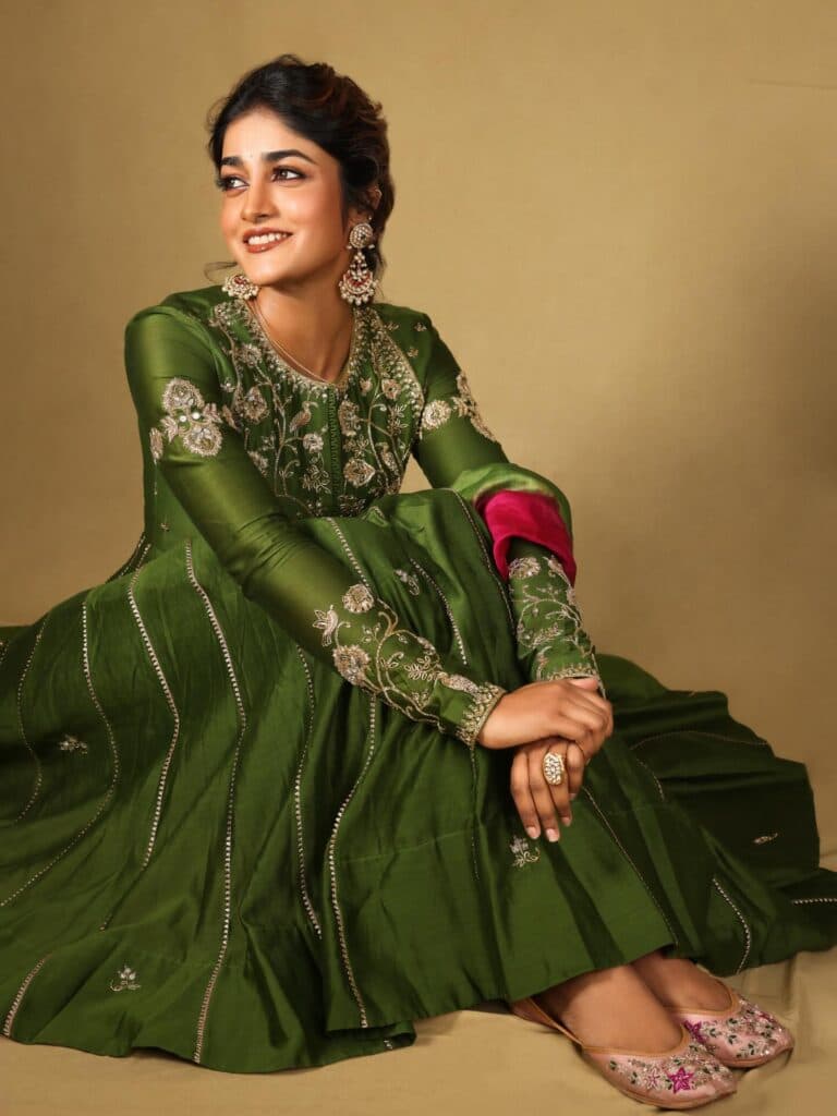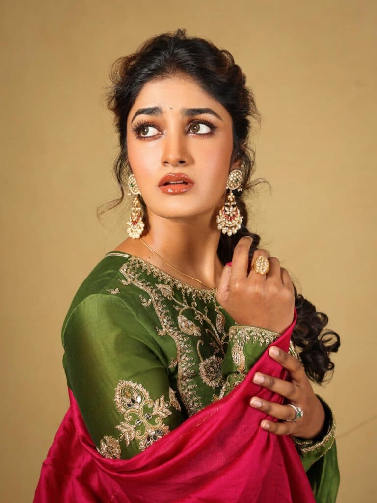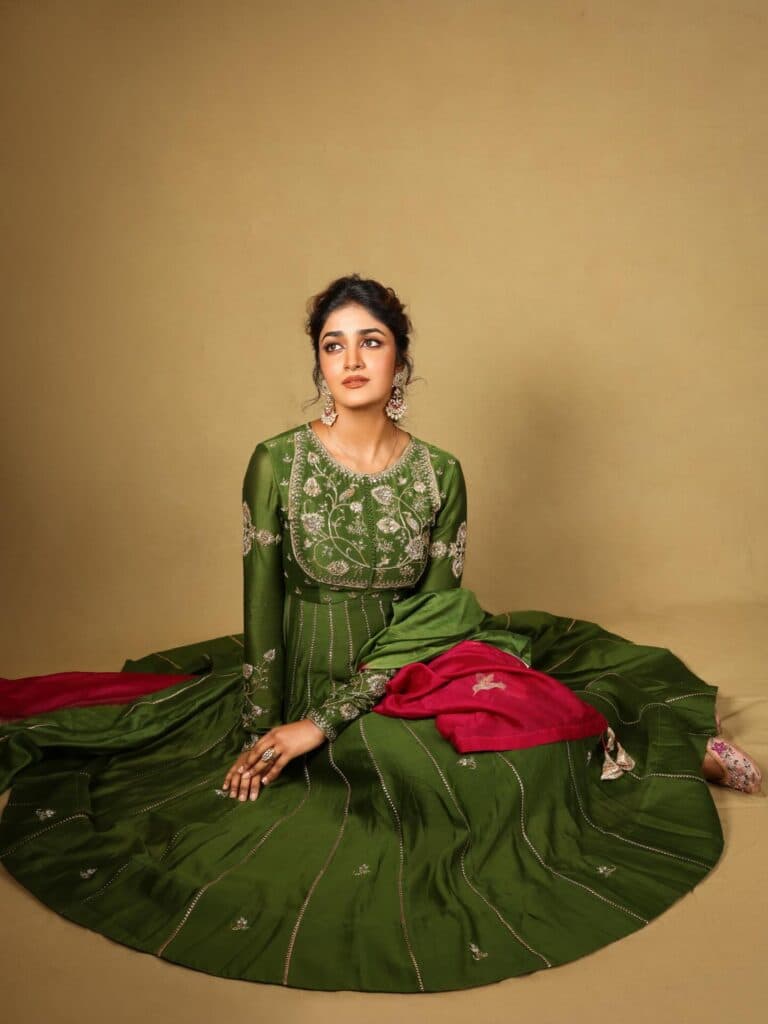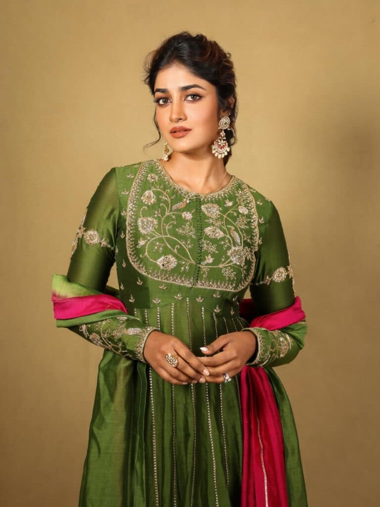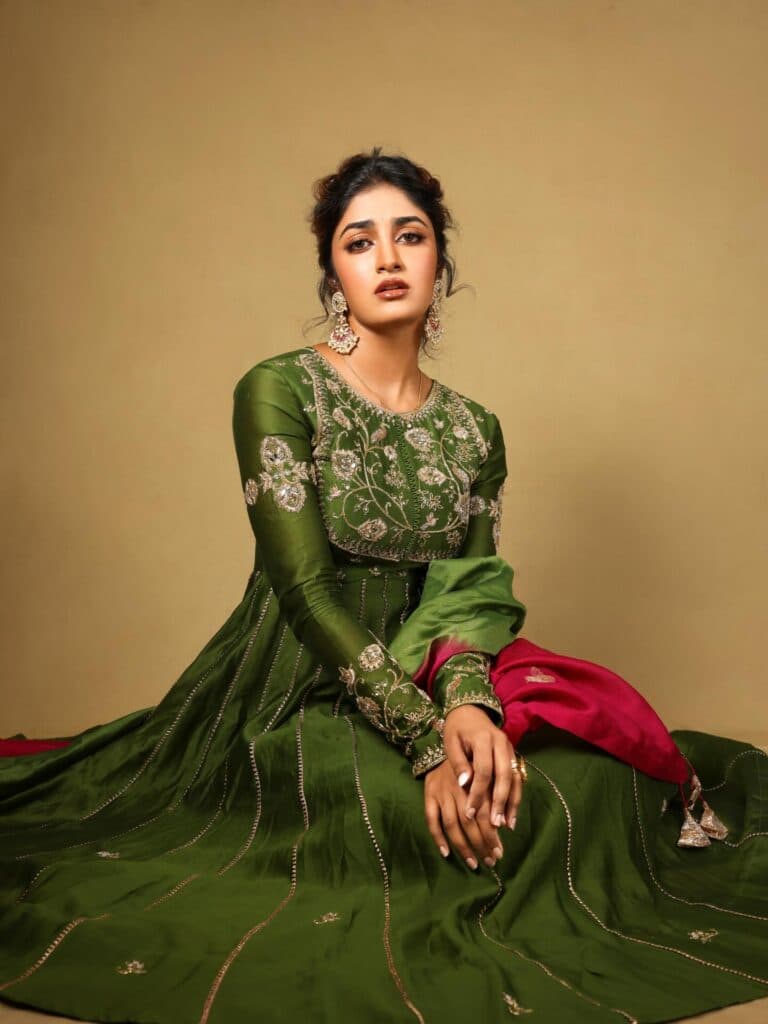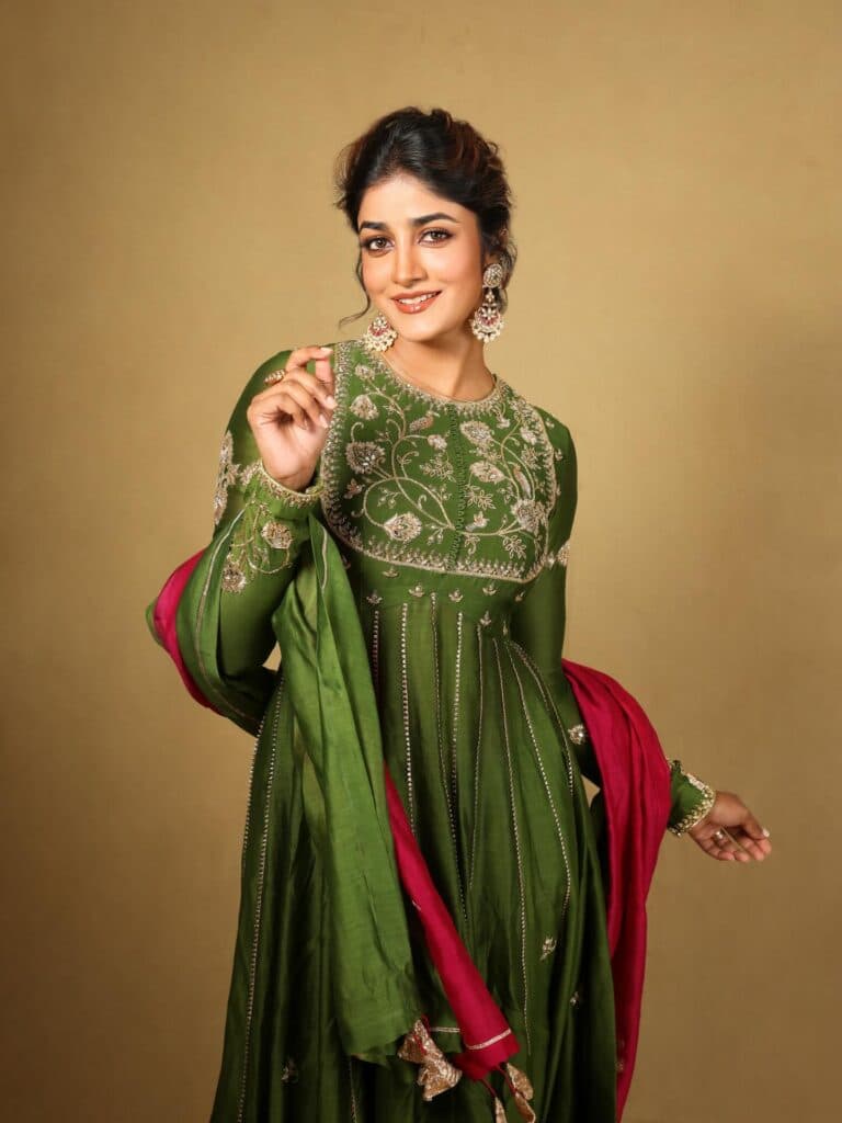 Dimple Hayathi is seen wearing a deep green traditional outfit with subtle embroidery, giving the overall look a simple and elegant feel. Soft makeup, neatly tied-back hair, statement earrings, and a hint of pink in the dupatta add a balanced contrast to the style.