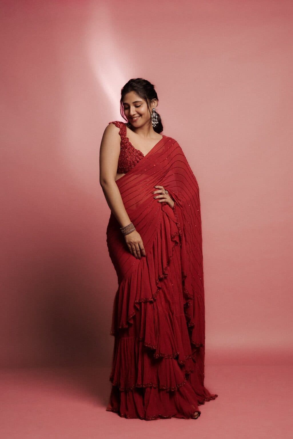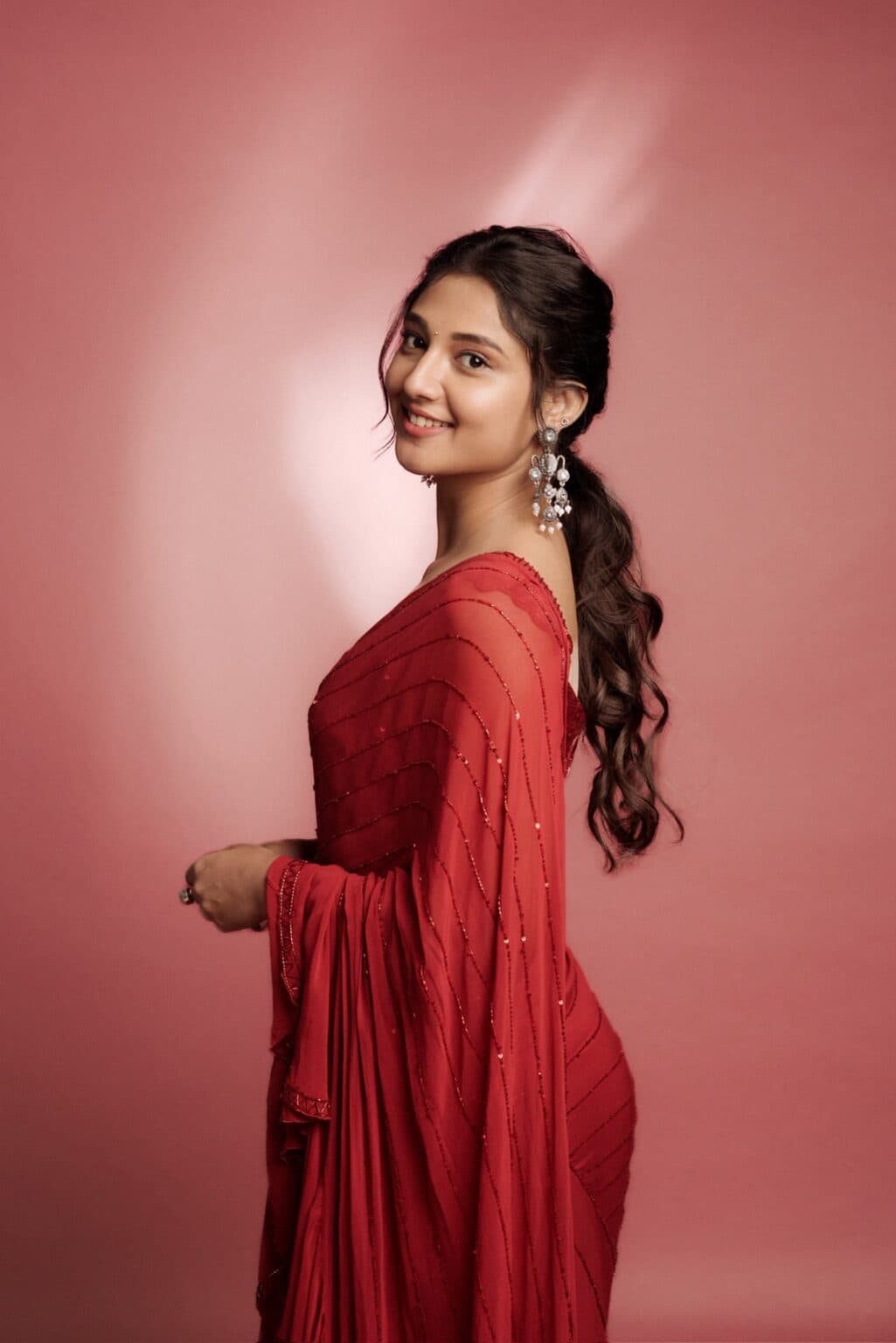 Ritika Nayak stole the spotlight at the Mirai success meet, dazzling in a gorgeous red saree that perfectly blended grace and sophistication. Her radiant presence lit up the event, leaving everyone impressed by her timeless elegance.