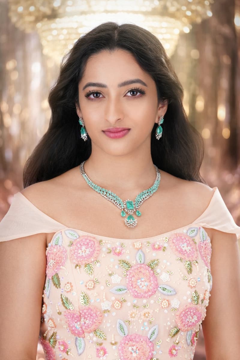 In one frame, she looks like a royal muse — dressed in a silk saree adorned with intricate temple jewelry, her calm poise amplifying the timeless charm of the outfit. In another, she embraces modern minimalism, donning a pastel gown with subtle shimmer, perfectly styled with diamond accessories that add just the right sparkle.