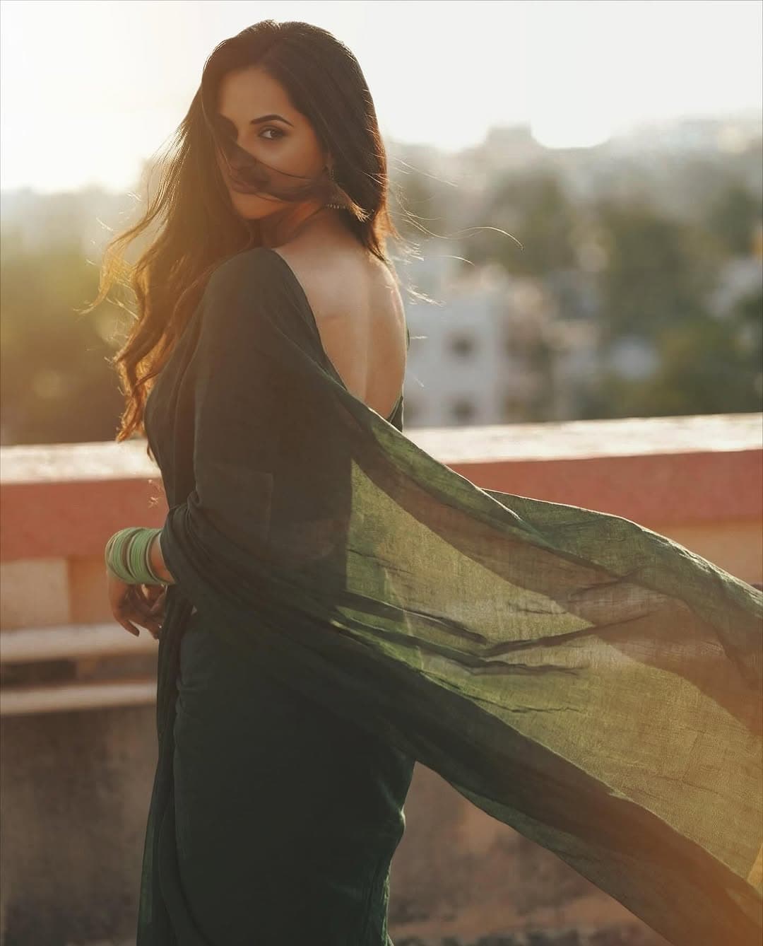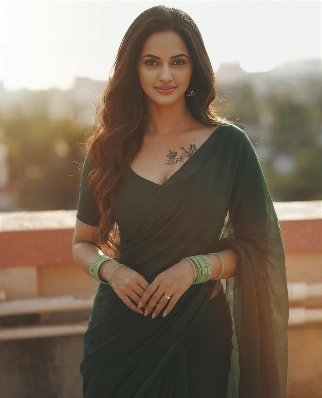Jyothi Poorvaj shared a stunning series of pictures on Instagram, draped in a graceful green saree that perfectly complemented the golden-hour backdrop. Her effortless poise, soft expressions, and traditional styling won instant admiration from fans.