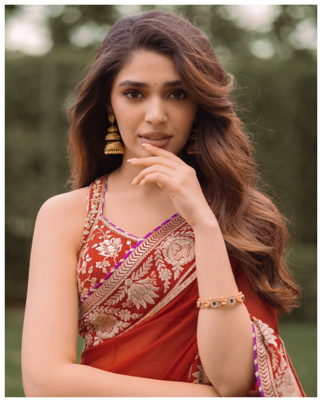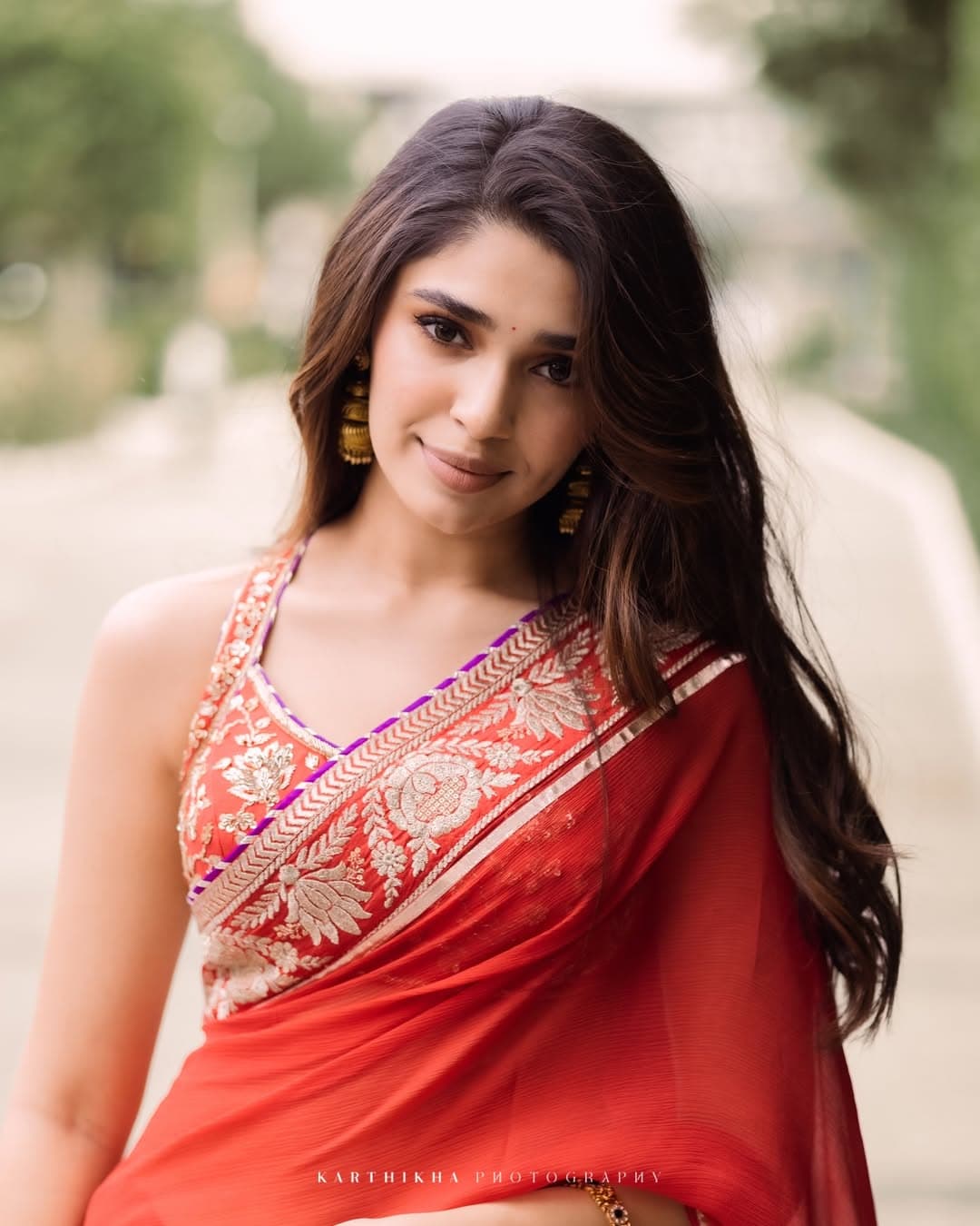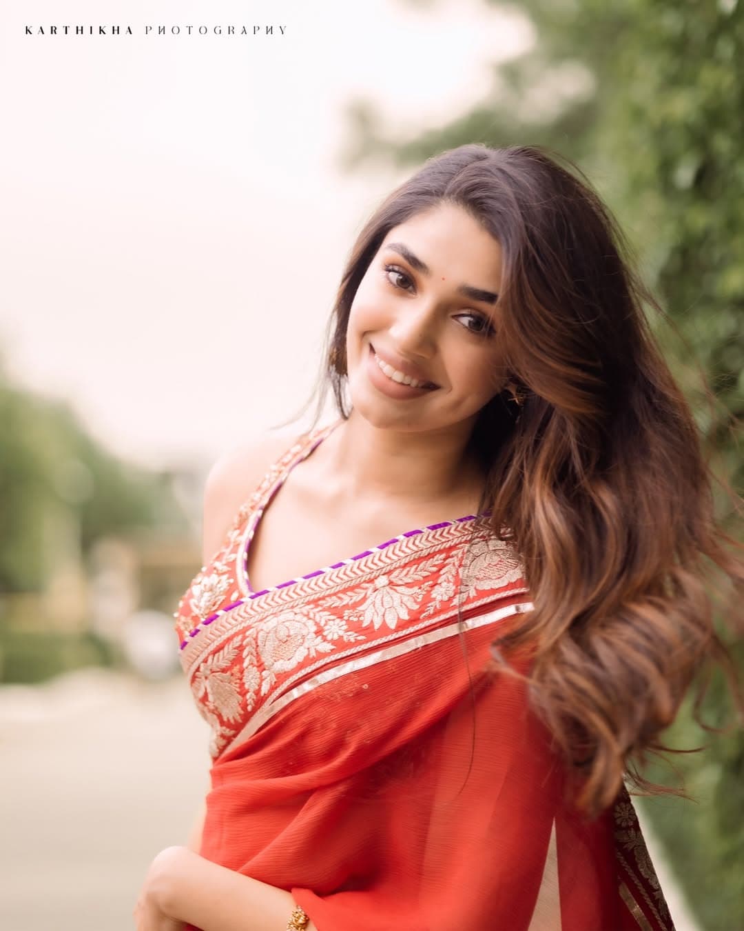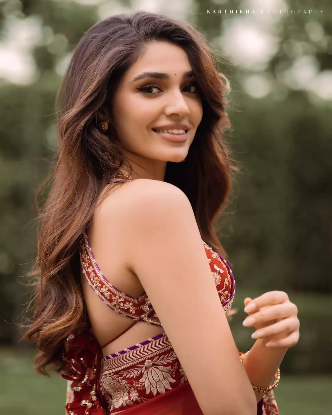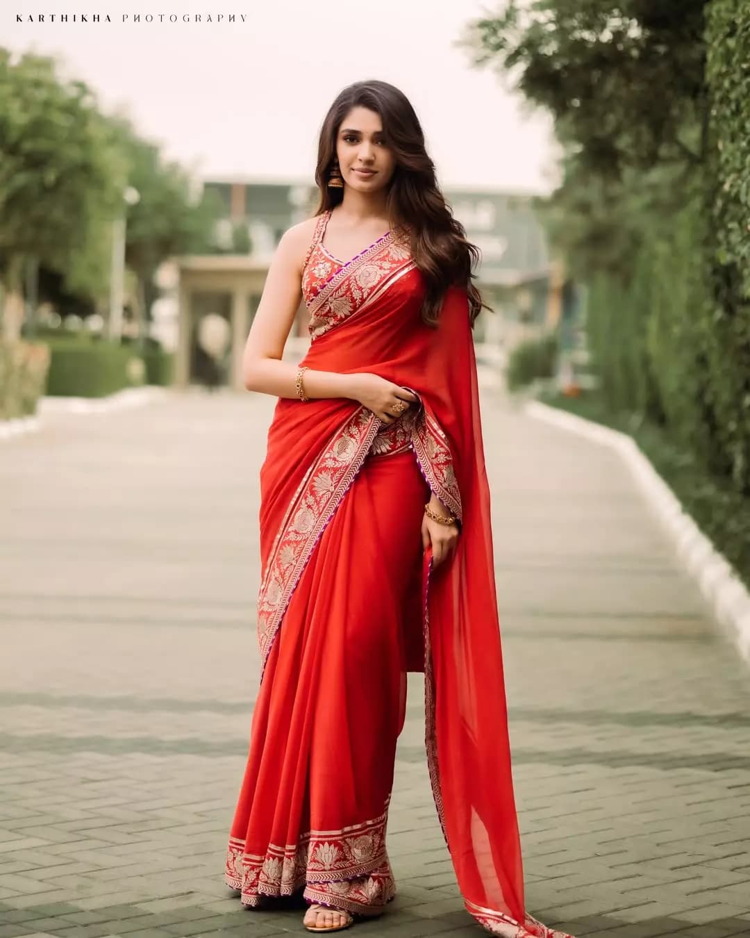 Krithi Shetty carries both elegance and a stylish vibe in her red saree look. Paired with a detailed designer blouse, her outfit appears highly classy and refined. Despite its simplicity, the styling stands out for delivering a premium and sophisticated look.