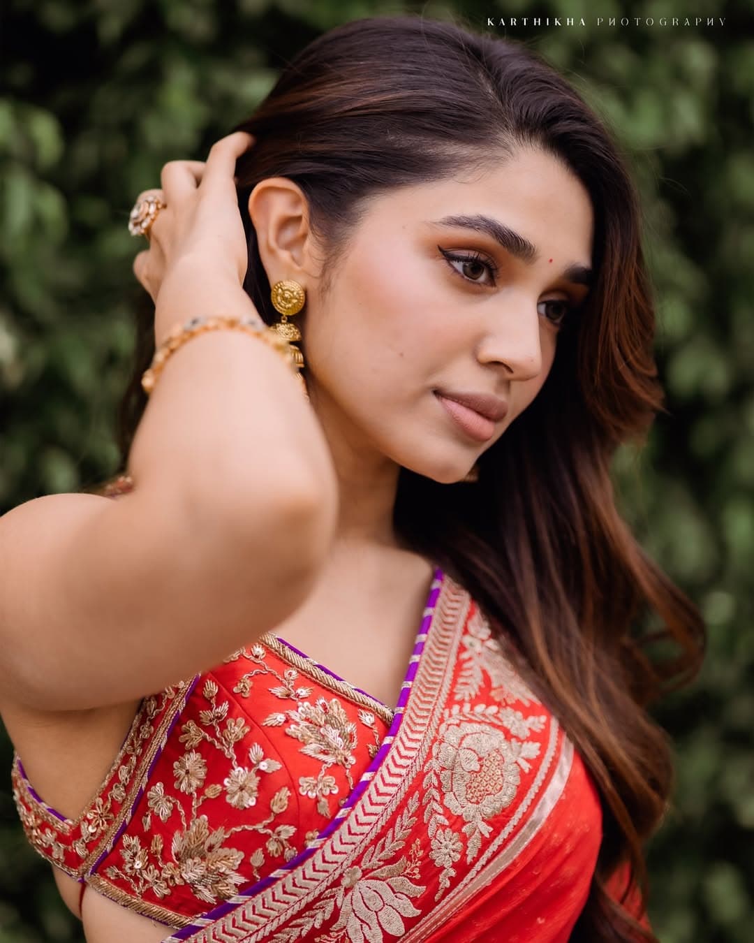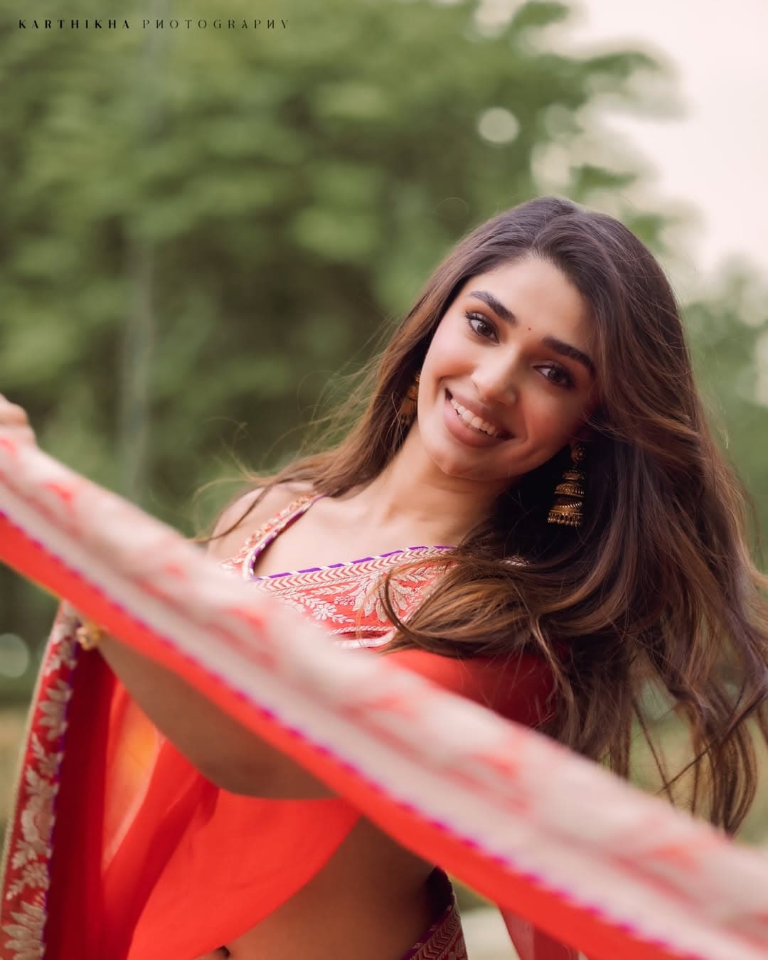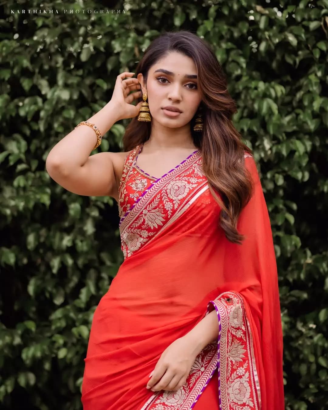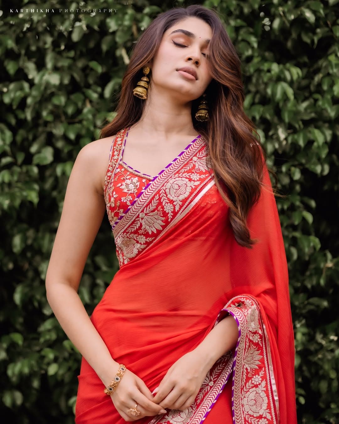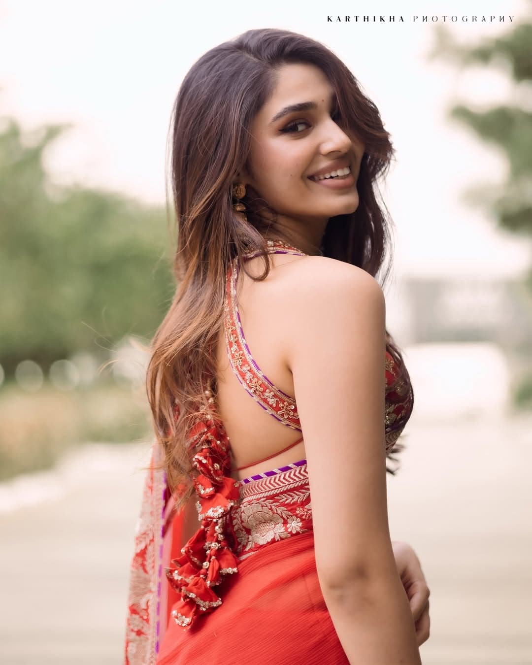 Krithi Shetty carries both elegance and a stylish vibe in her red saree look. Paired with a detailed designer blouse, her outfit appears highly classy and refined. Despite its simplicity, the styling stands out for delivering a premium and sophisticated look.