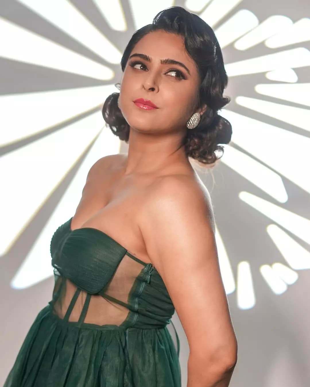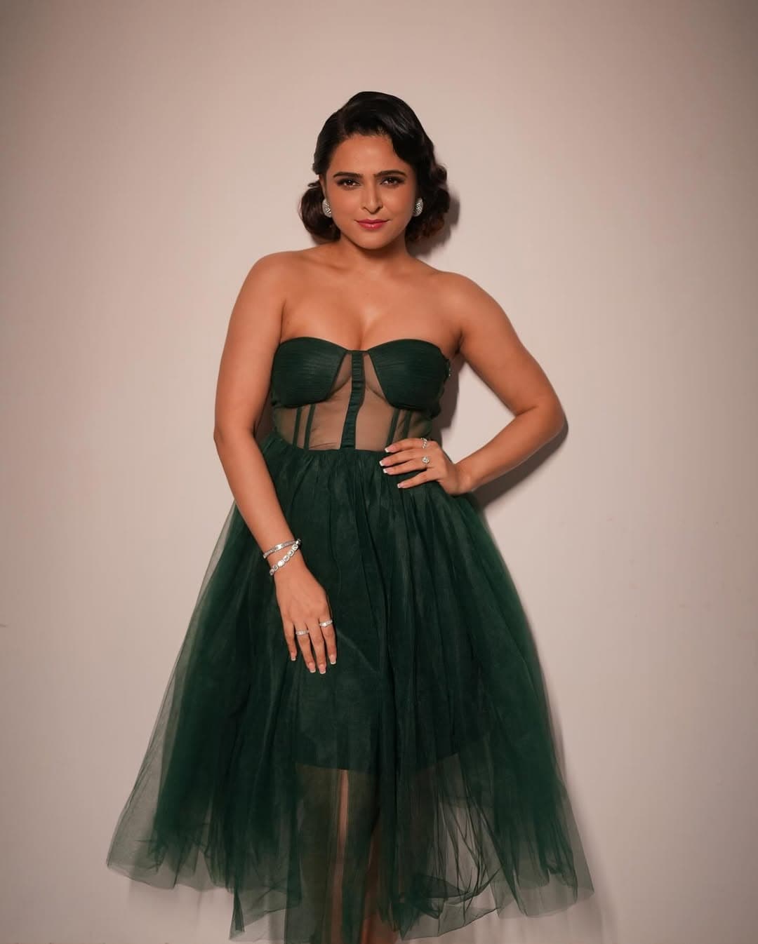Madhurima Tuli stuns in a deep green retro-themed outfit with a wide net flare, styled by a talented creative team. She captioned the elegant photo “Retro vibes.”