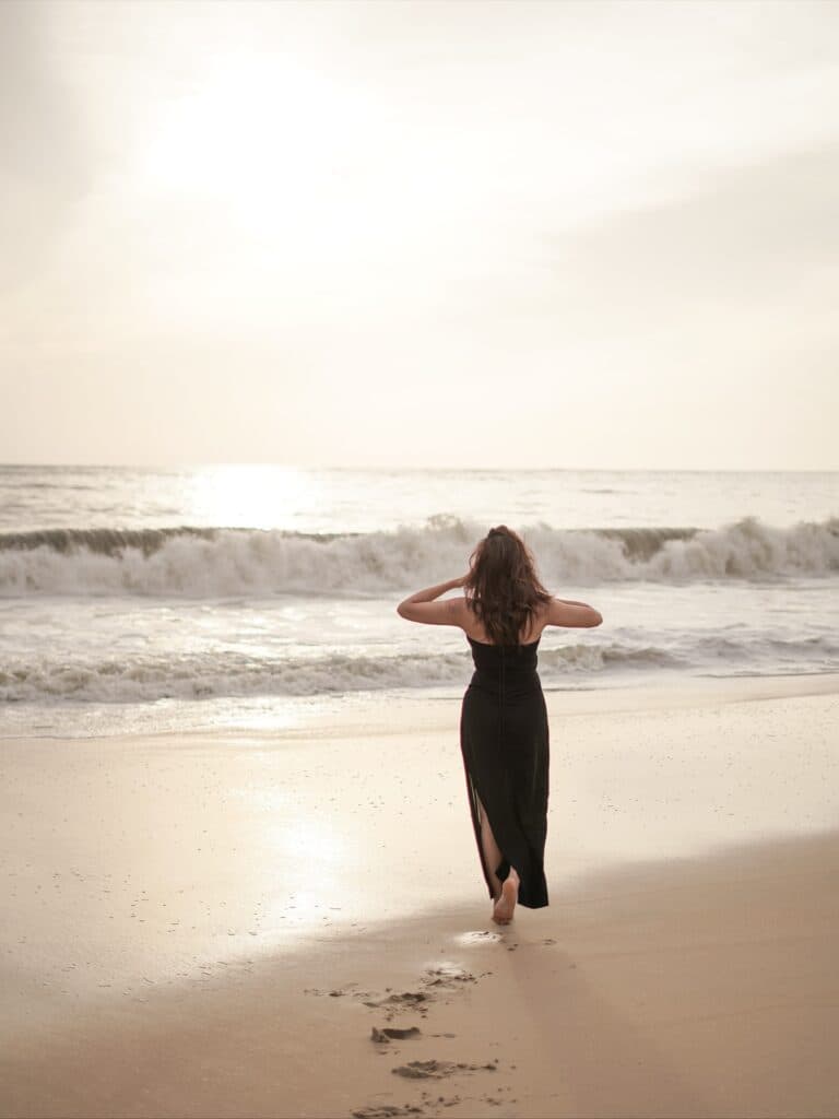 Wearing a black gown with a thigh-high slit, she’s seen sitting on a half-soaked wooden chair as the sea foam rolls in. Her hair’s messy in the best way, her makeup light, and her expression somewhere between calm and fire. The whole look feels raw, not overly polished, like a moment that just happened, not one that was staged.
