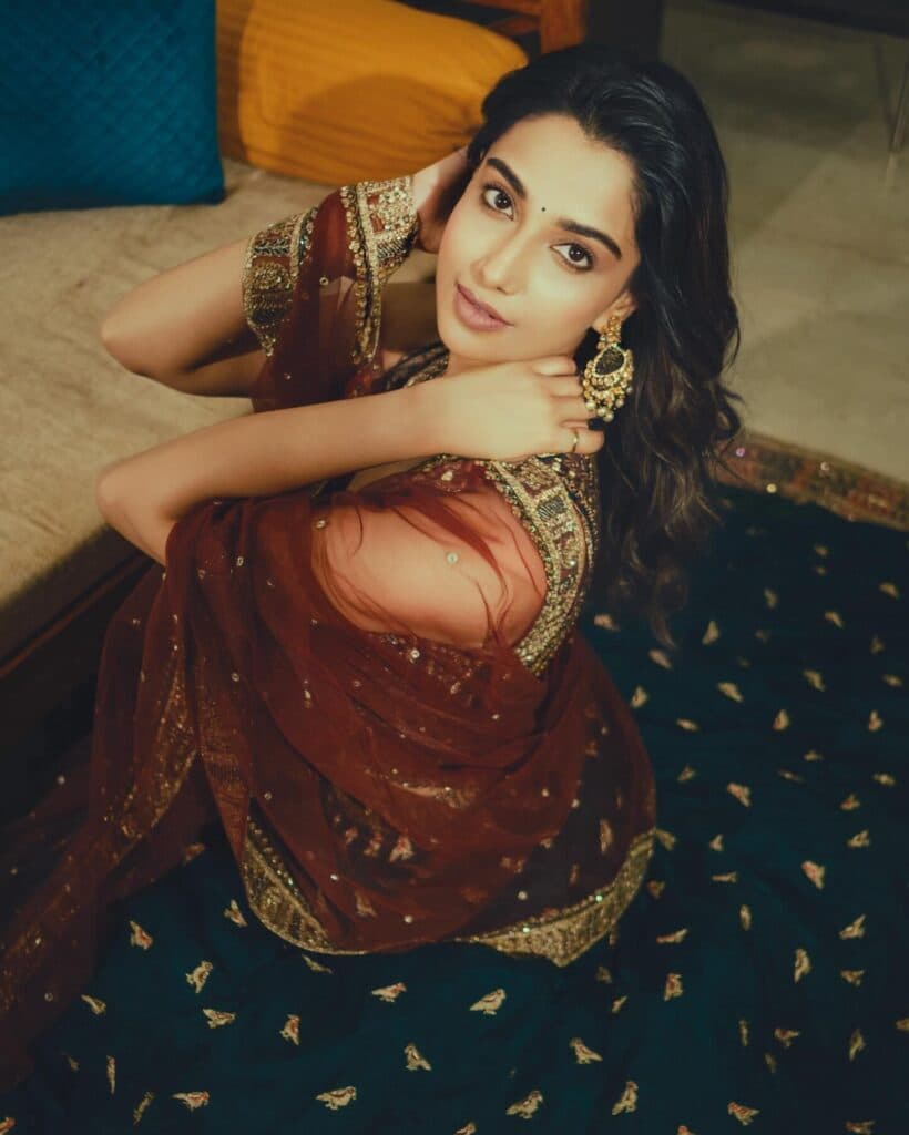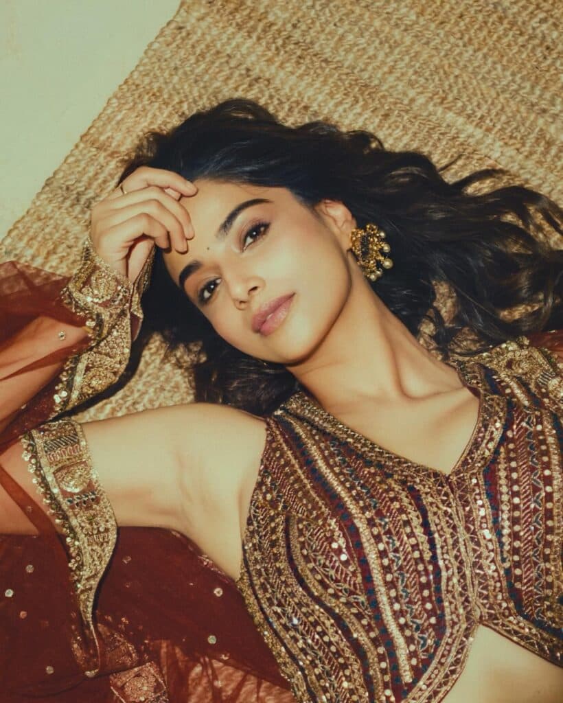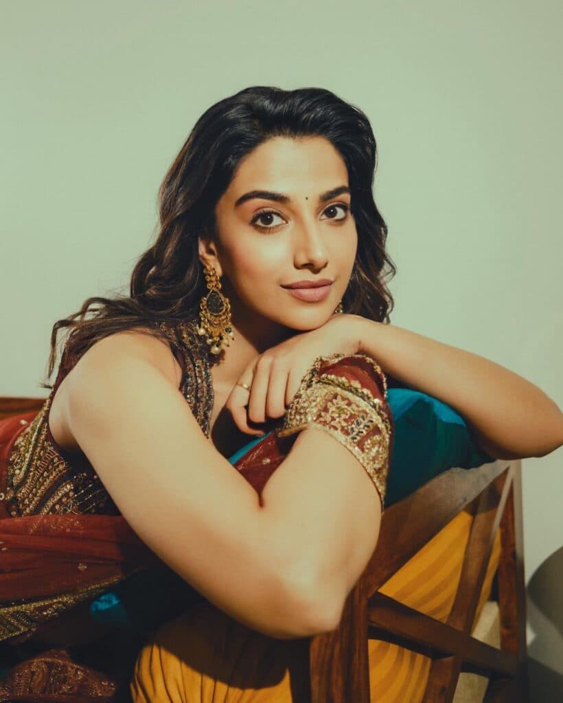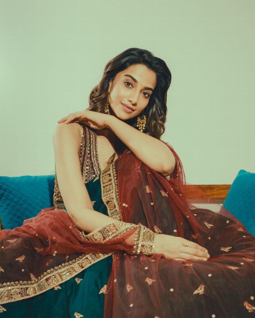 Meenakshi Chaudhary looks effortlessly elegant in a beautifully styled traditional ensemble. Her soft expressions and poised posture highlight her natural grace and confidence. The classic look perfectly blends tradition with contemporary charm.