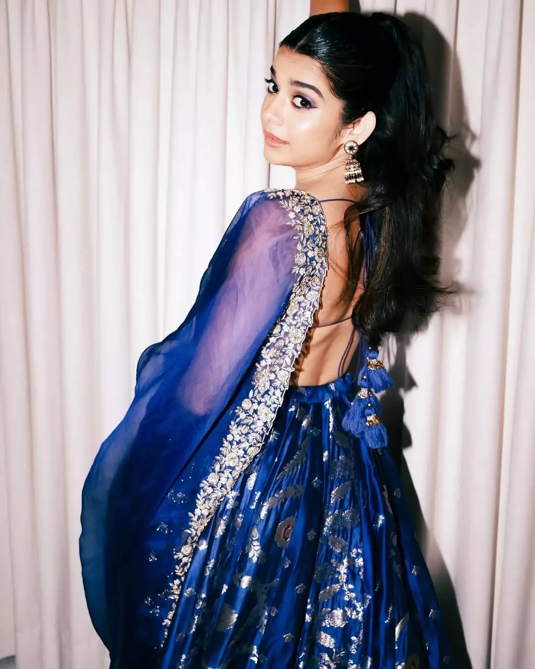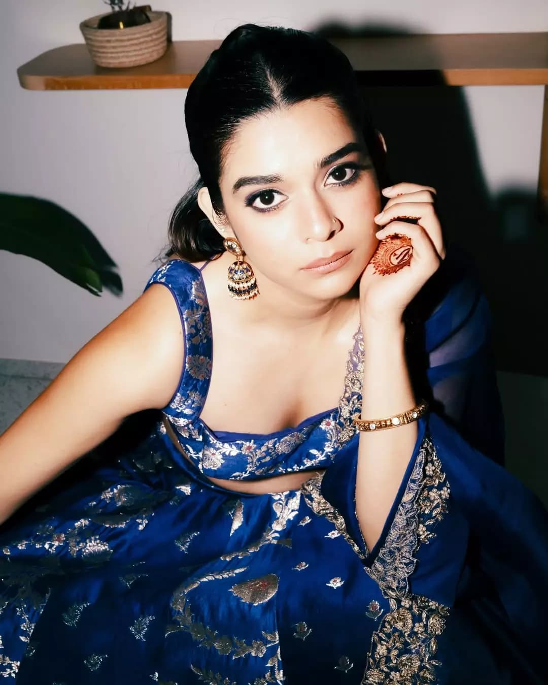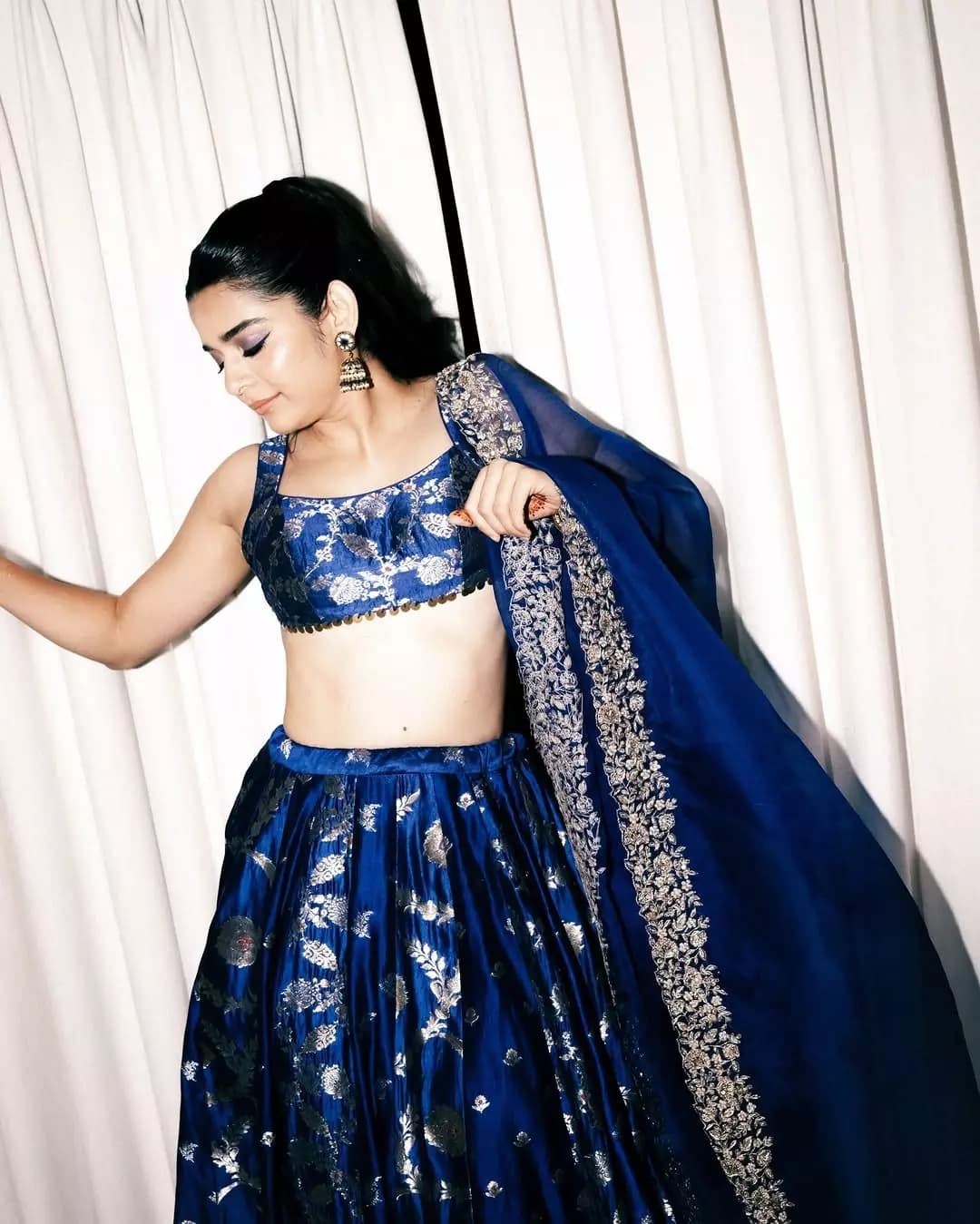 Mithila Palkar looks radiant in a royal blue lehenga adorned with delicate silver embroidery and graceful floral patterns. The sleeveless blouse with coin detailing and a richly embellished dupatta add a timeless traditional charm to her effortlessly elegant look.