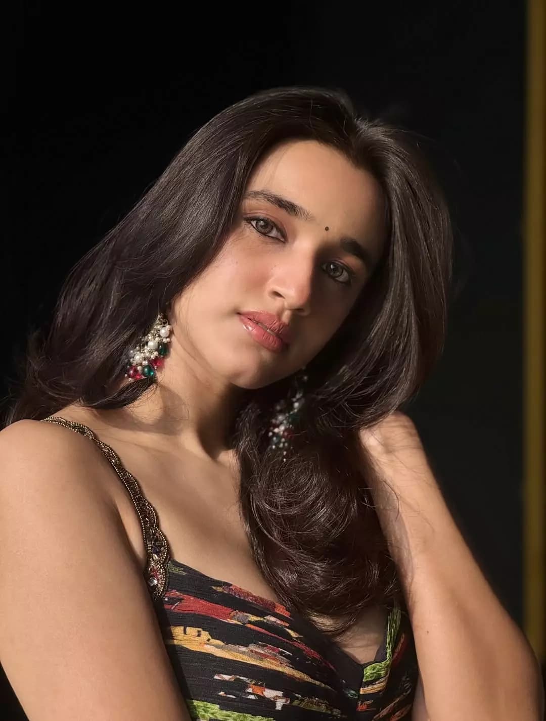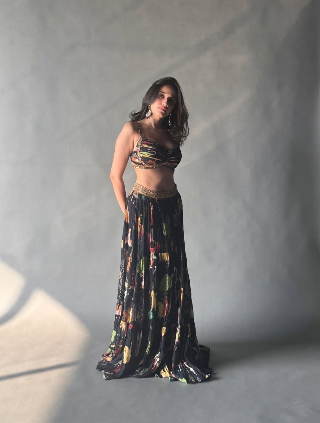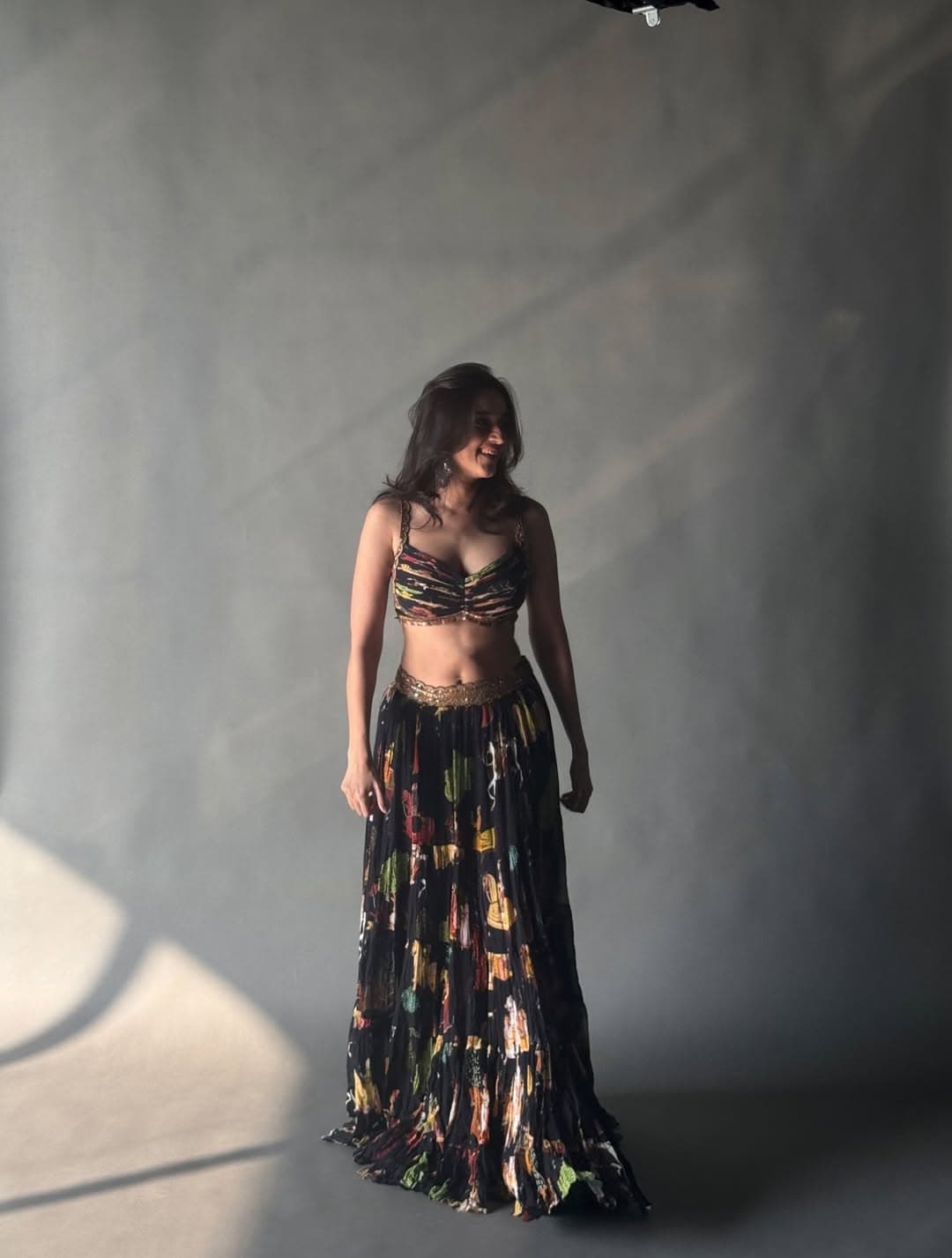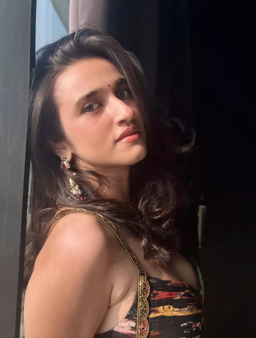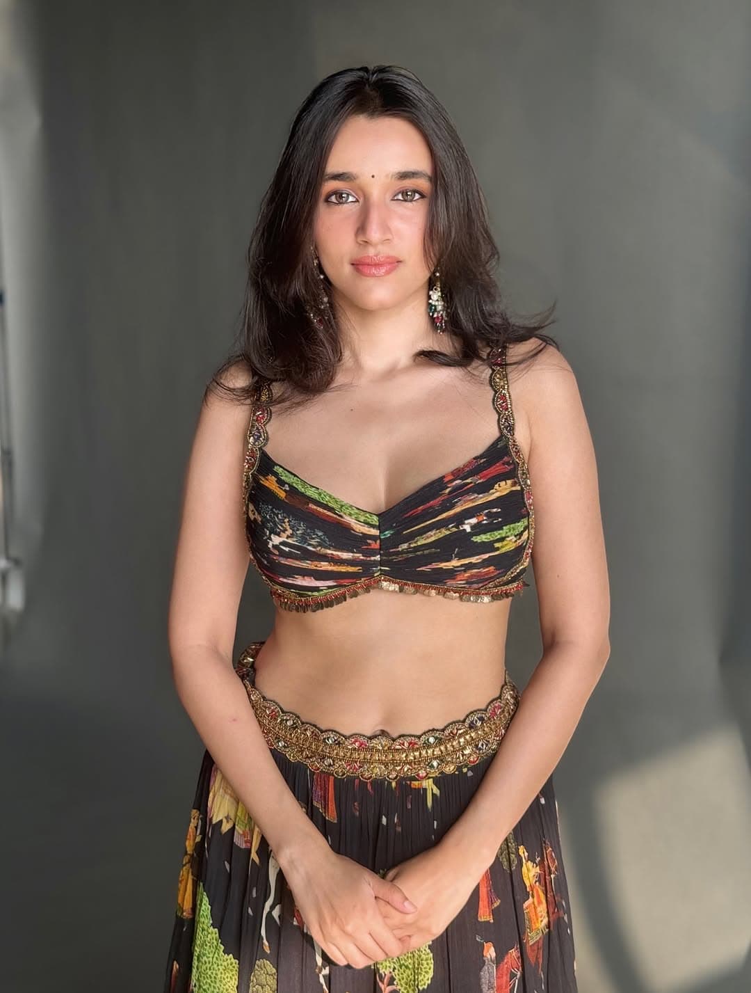 Nuveksha’s natural facial glow and simple styling enhance her beauty even more. The lehenga choli she wears, with its rich blend of colors and delicate craftsmanship, looks truly captivating, while her naturally radiant charm stands out as a special highlight.