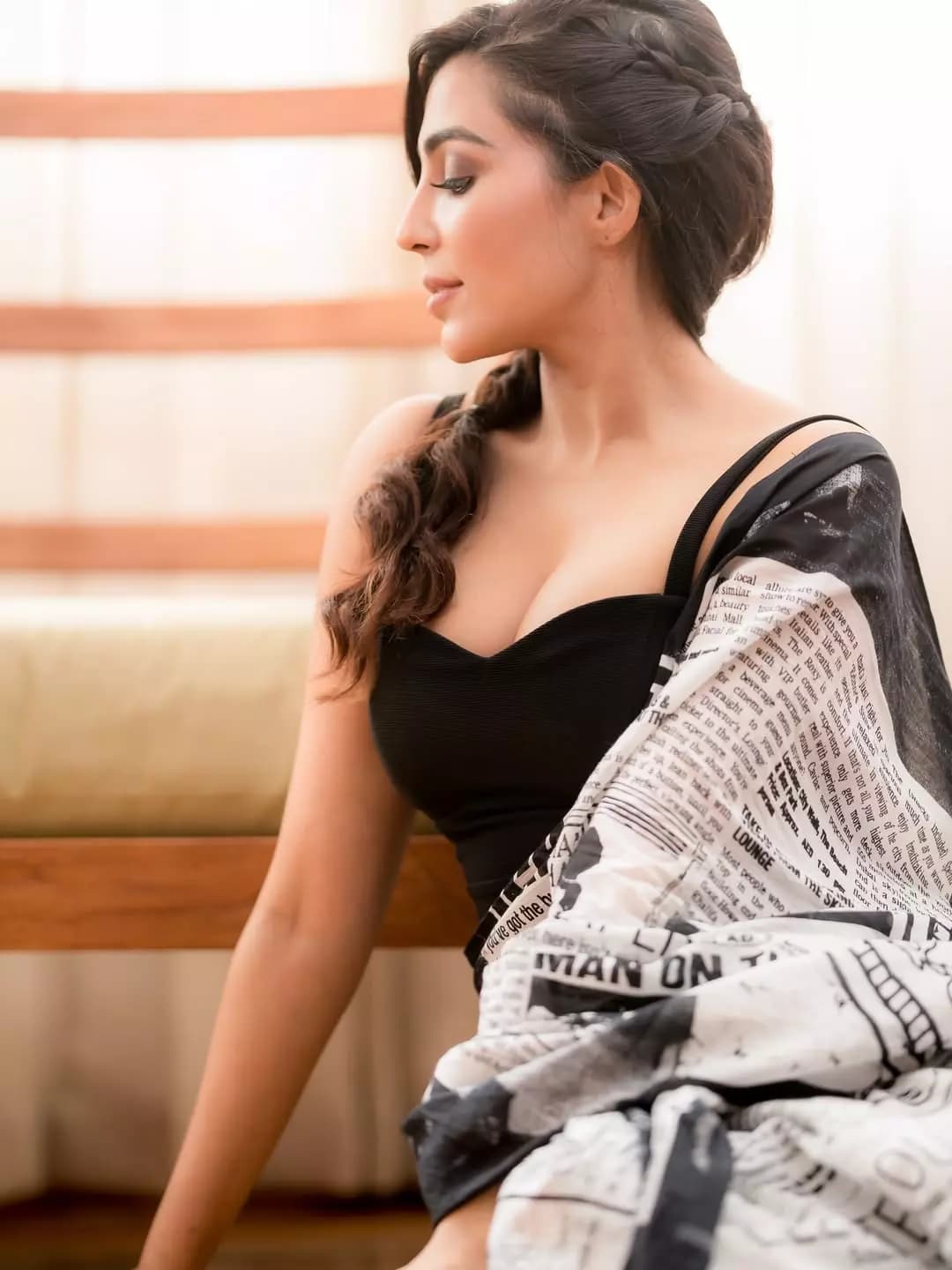 Parvati Nair looks beautiful with her charming smile and graceful pose. She wears a stylish black blouse with a unique printed saree that gives her a modern and elegant look.