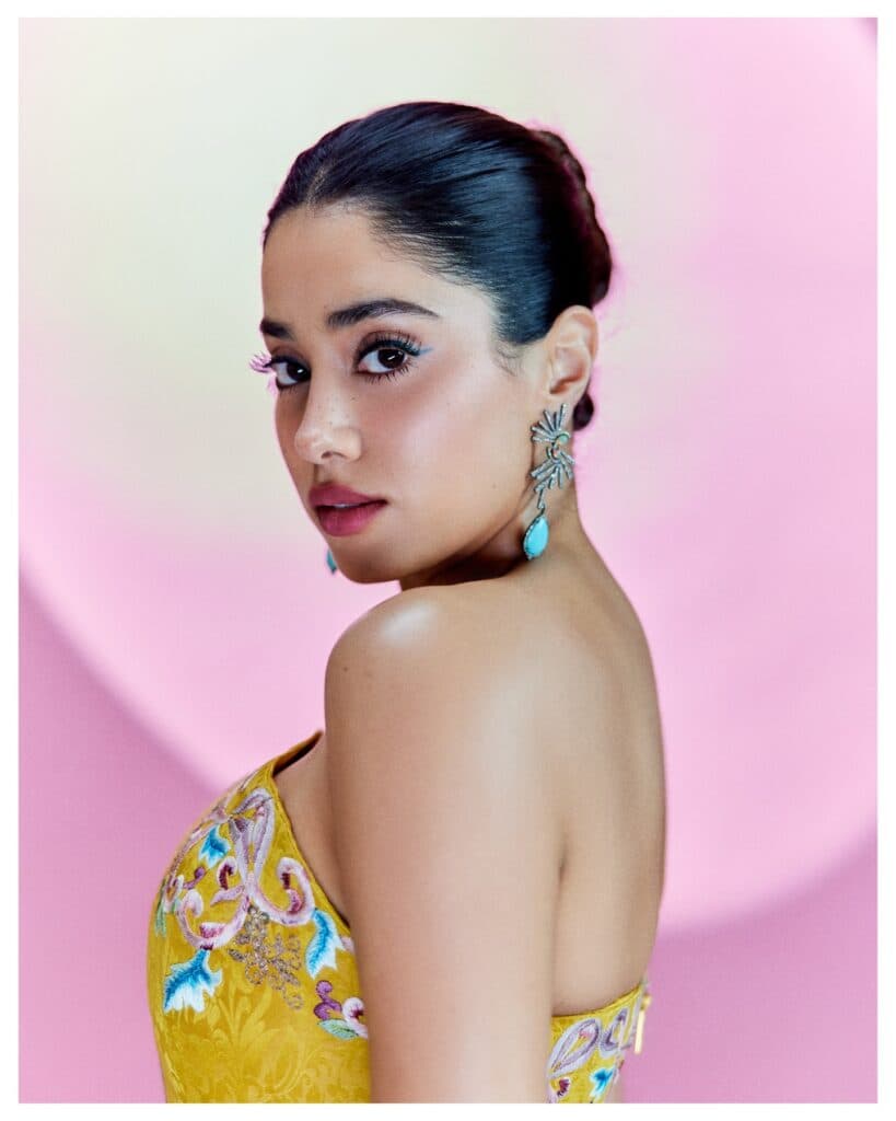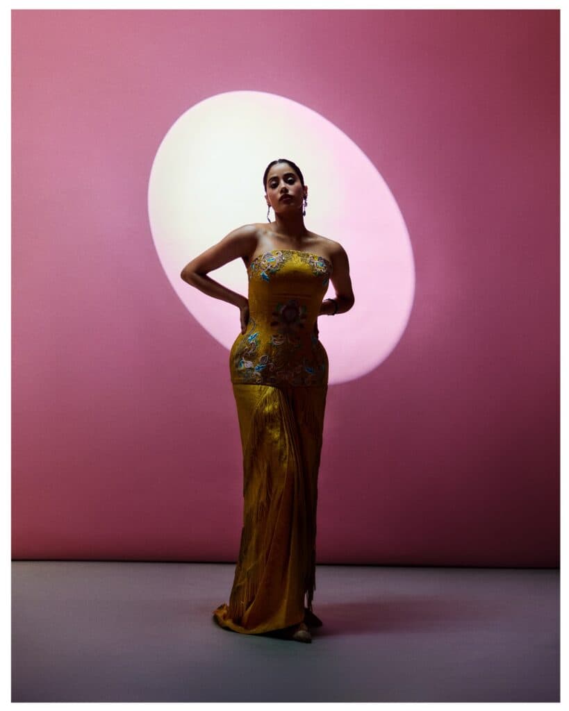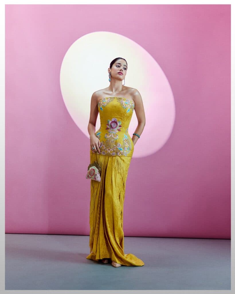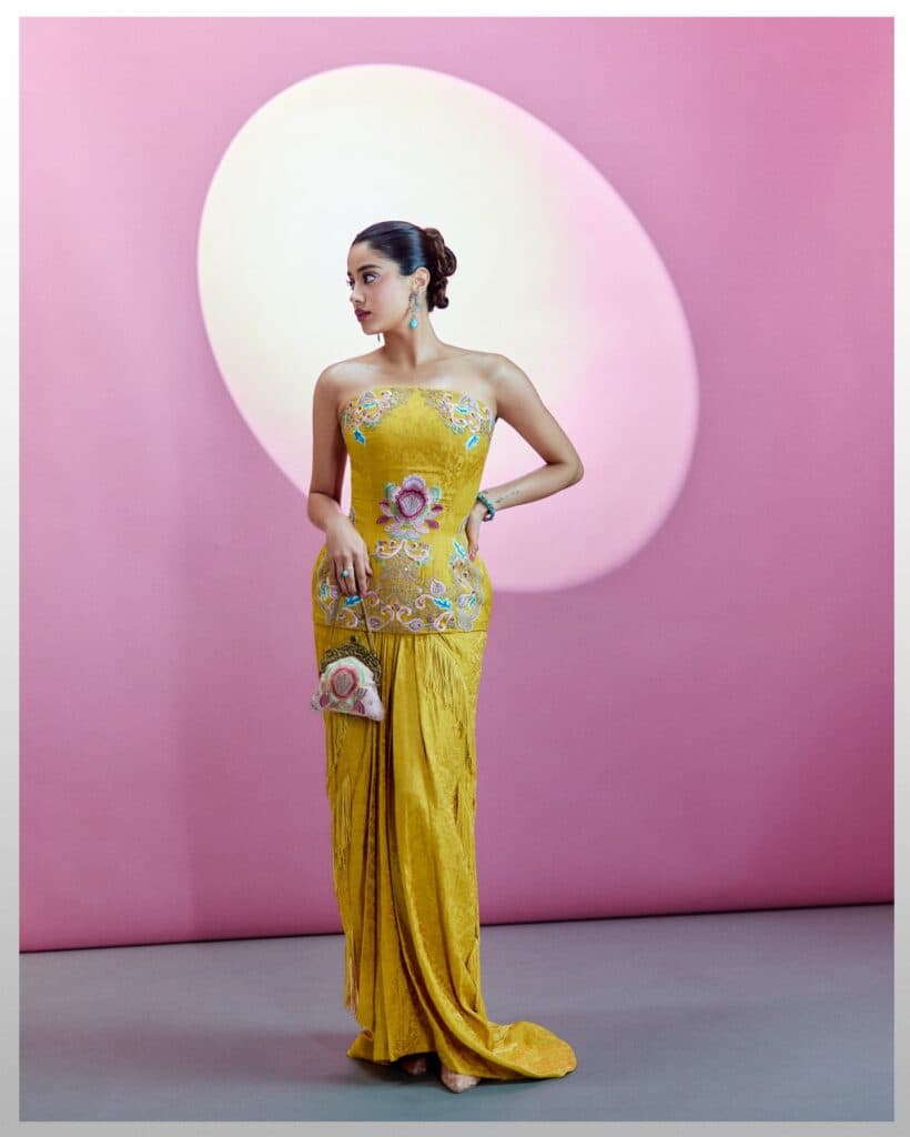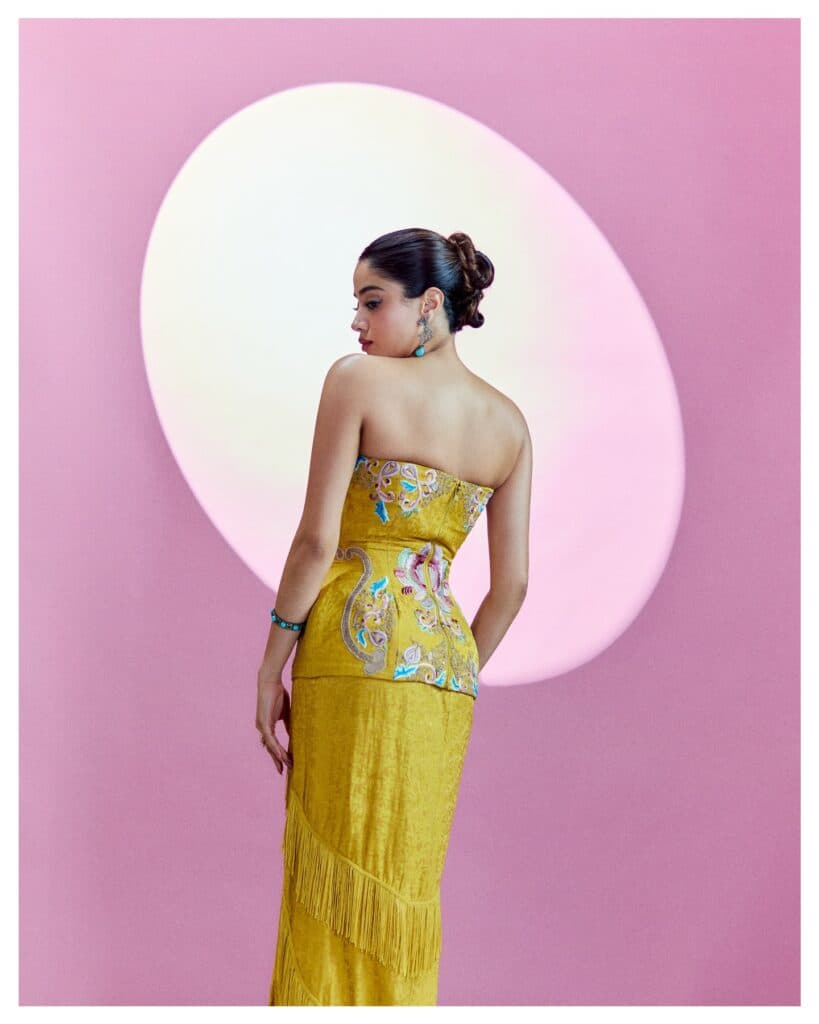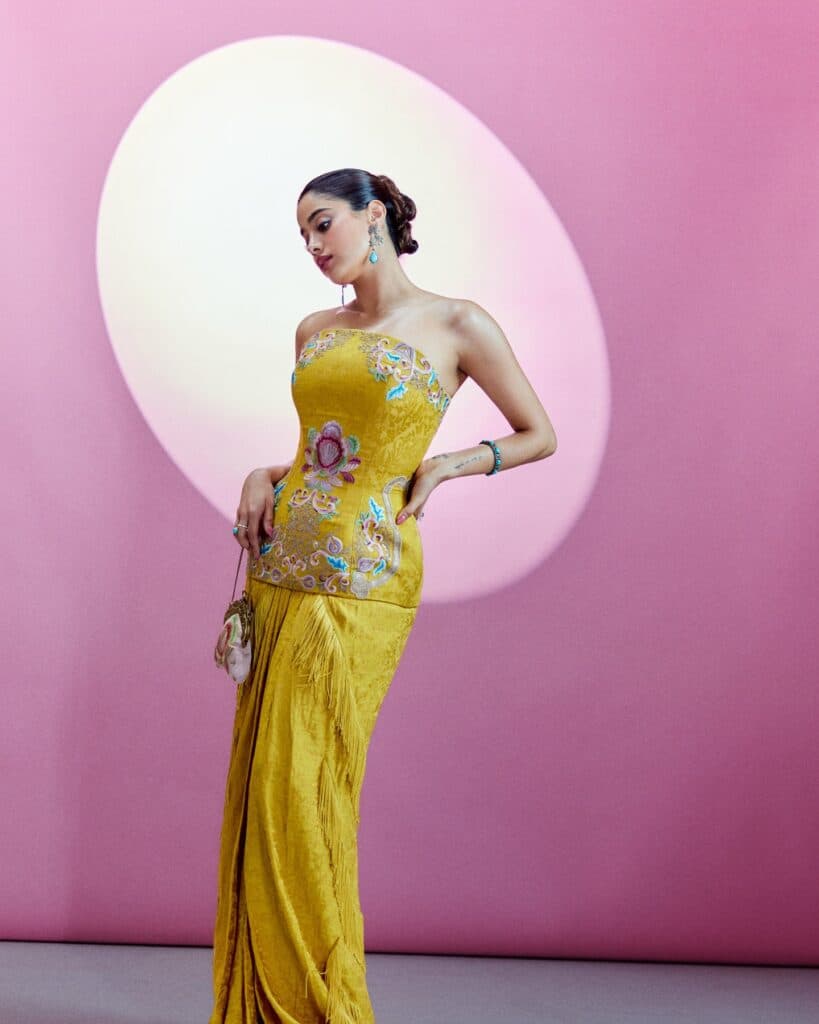 Meanwhile, the new photos she shared today have taken over social media. Dressed in a mustard-yellow outfit adorned with colourful embroidery, she looks like a half-finished painting brought to life—sleek bun, structured shoulders, and a tiny bag hanging with effortless poise.
