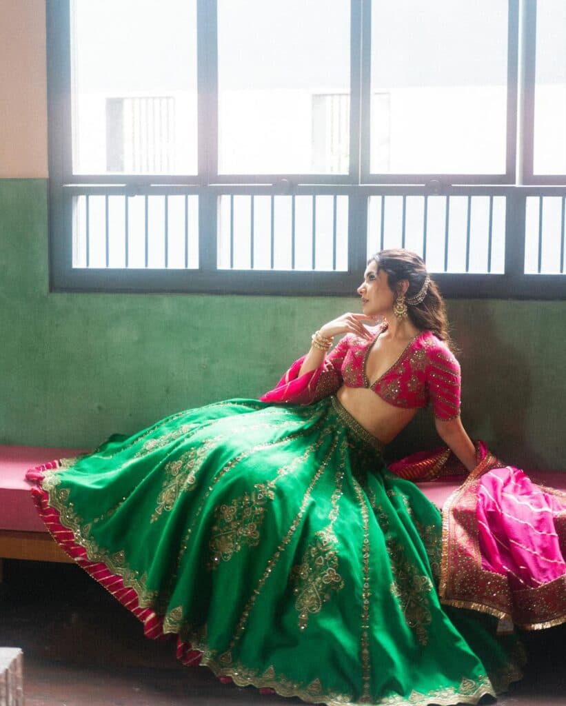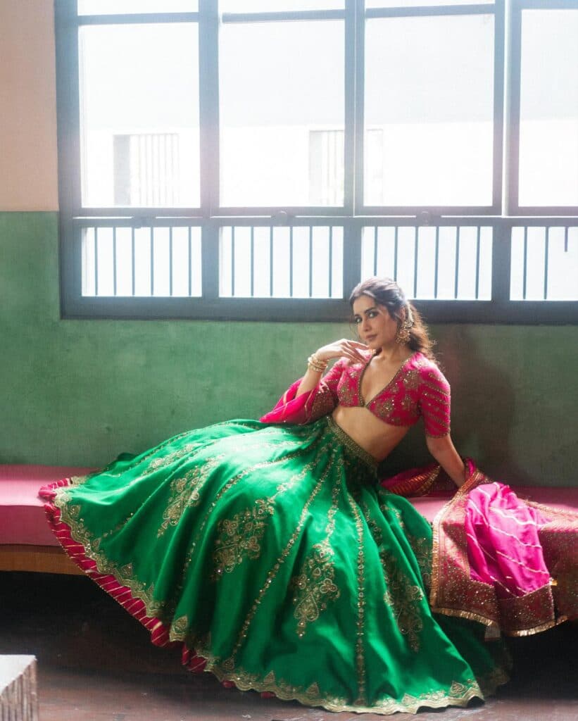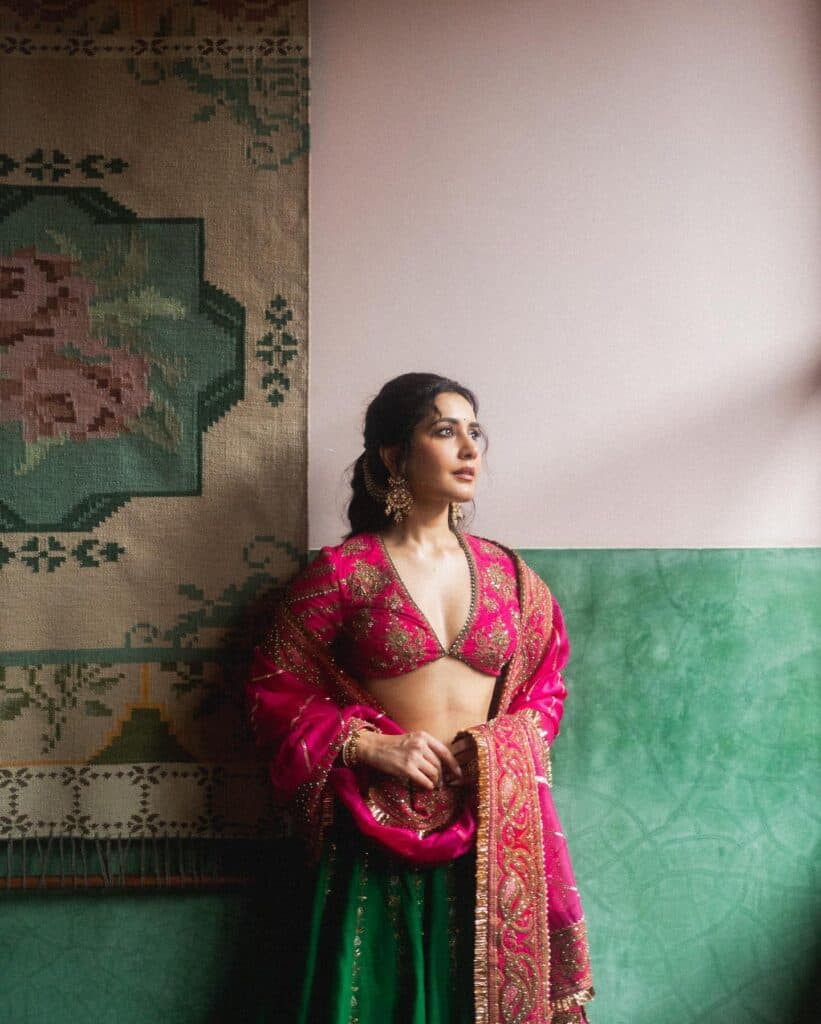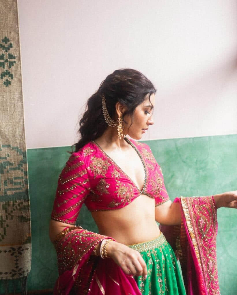Raashi Khanna poses like a living masterpiece, sunlight gently caressing her skin as the balcony transforms into her personal stage. Her pink blouse, cut in a stylish bralette design, radiates boldness and modern charm, while the meticulously stitched fitted sleeves retain a touch of traditional elegance. The ensemble strikes a perfect balance, making her look simultaneously playful, confident, and effortlessly graceful.