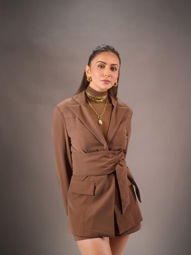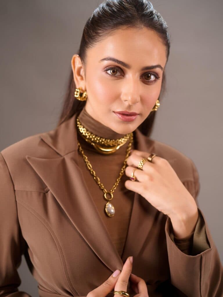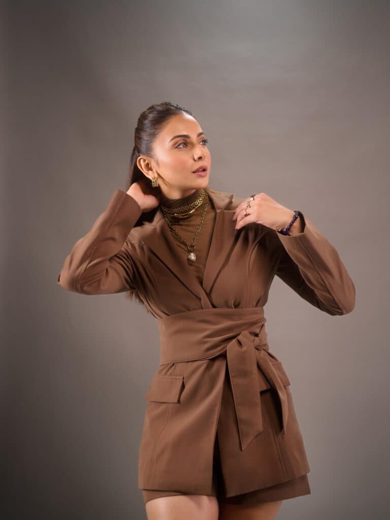 Rakul Preet Singh has recently been very open about her flop phase in Tollywood, and trolls immediately reacted when she mentioned her old films during De De Pyaar De 2 promotions. Rakul, on the other hand, seems utterly unfazed, opting to maintain concentration and ignore the negativity. Her most recent pictures speak louder than words; she looks strong in a well-fitting brown suit and tastefully layered gold jewelry. She knows she perfected the look, as evidenced by the assurance in her poses. Fans are now interested in her next move after waiting years for a big hit. Many people are wondering if she will keep up her recent glamorous choices or surprise them with something different. In any case, she is once again the center of attention.
