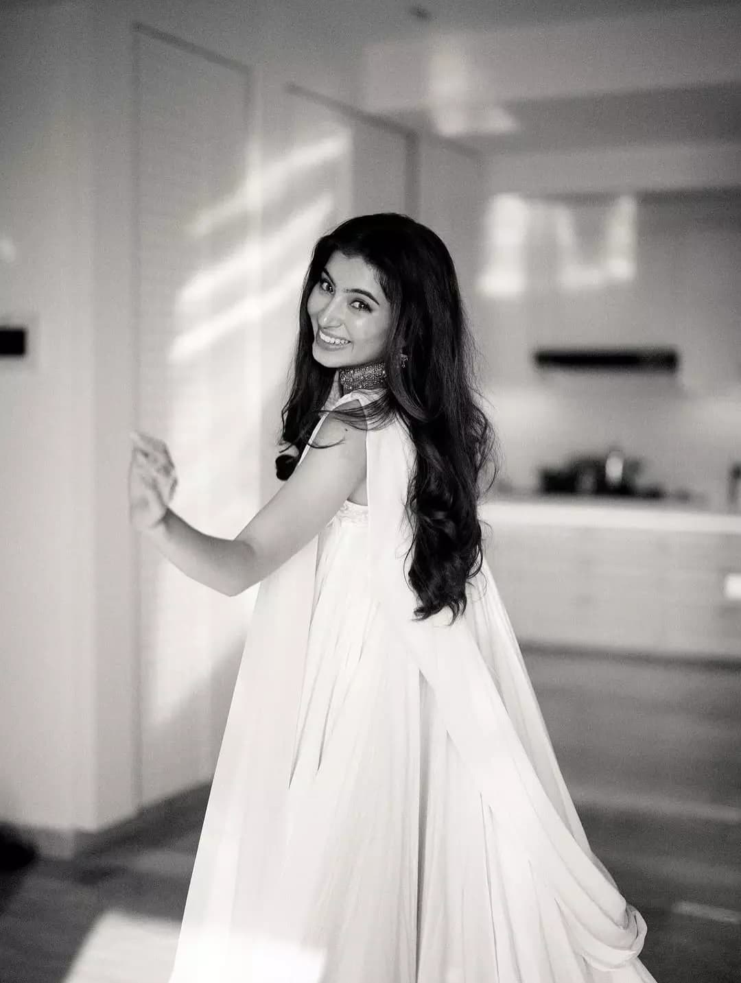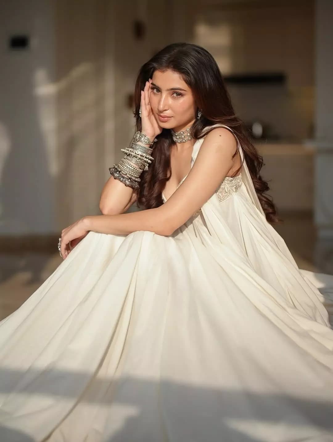 Sara Arjun is seen wearing a light-colored traditional outfit with subtle embroidery work. The simple jewellery and open hair complete her clean and elegant look.