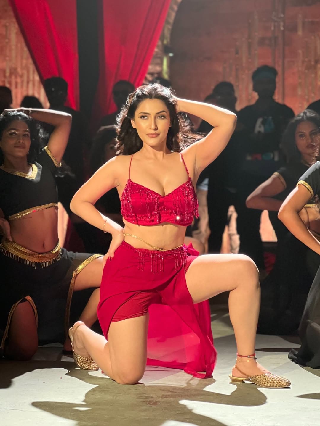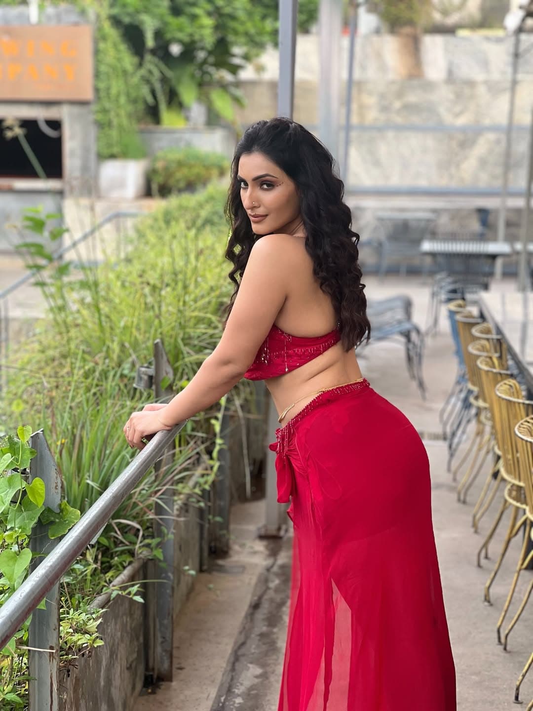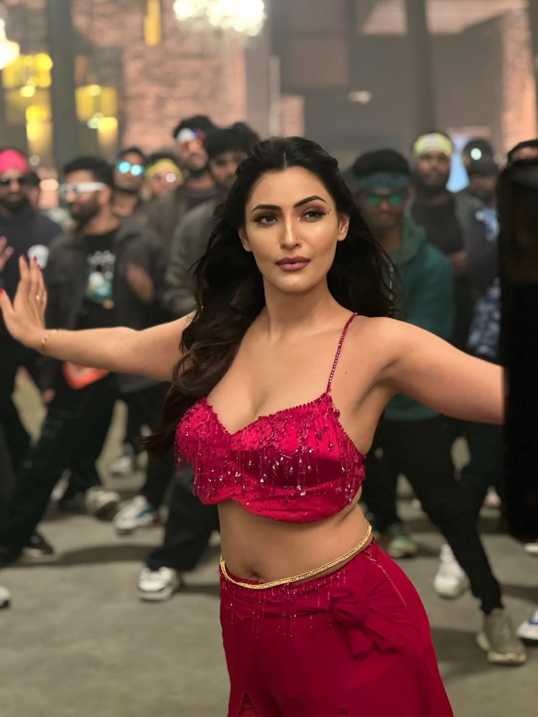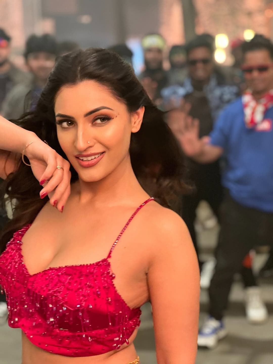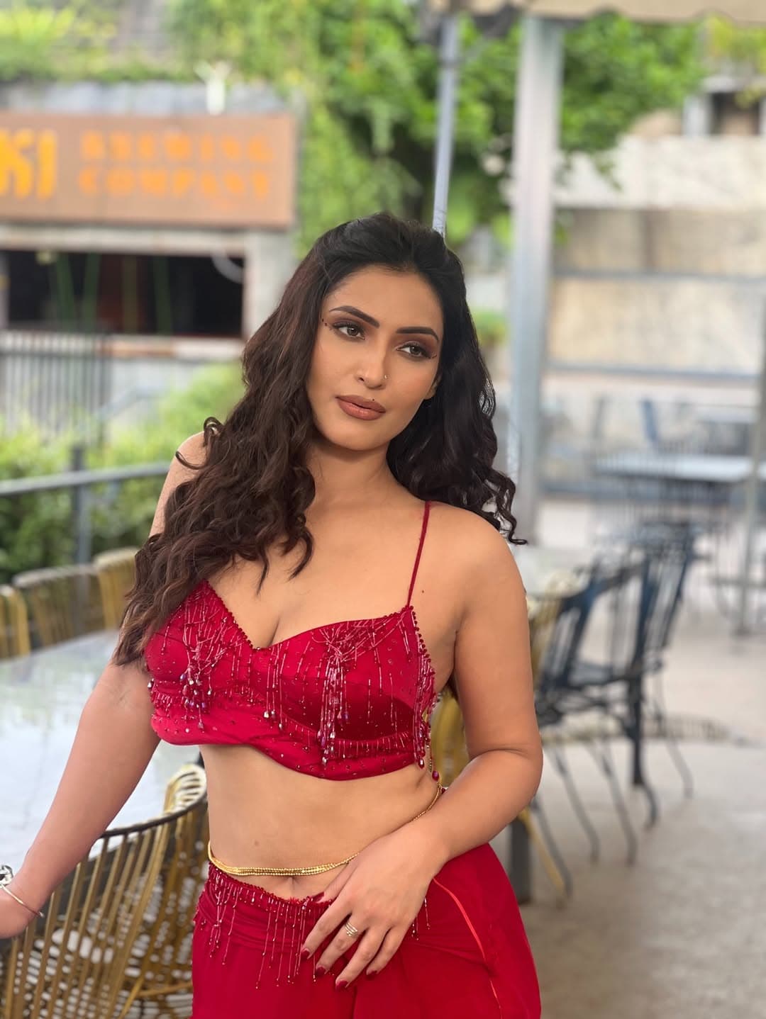 Shivangi Verma is trending on social media with her stylish red look from the Terror song. Dressed in a shimmering sequined bralette paired with a flowing draped skirt and a golden waist chain, her outfit delivers a complete glam vibe. She completed the look with sparkling heels, making it a striking modern fashion statement.