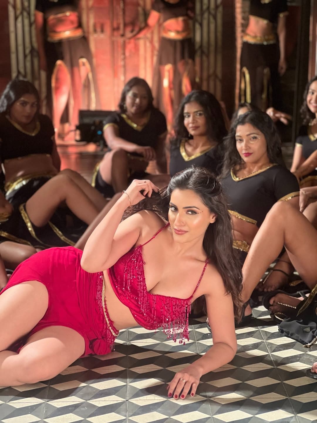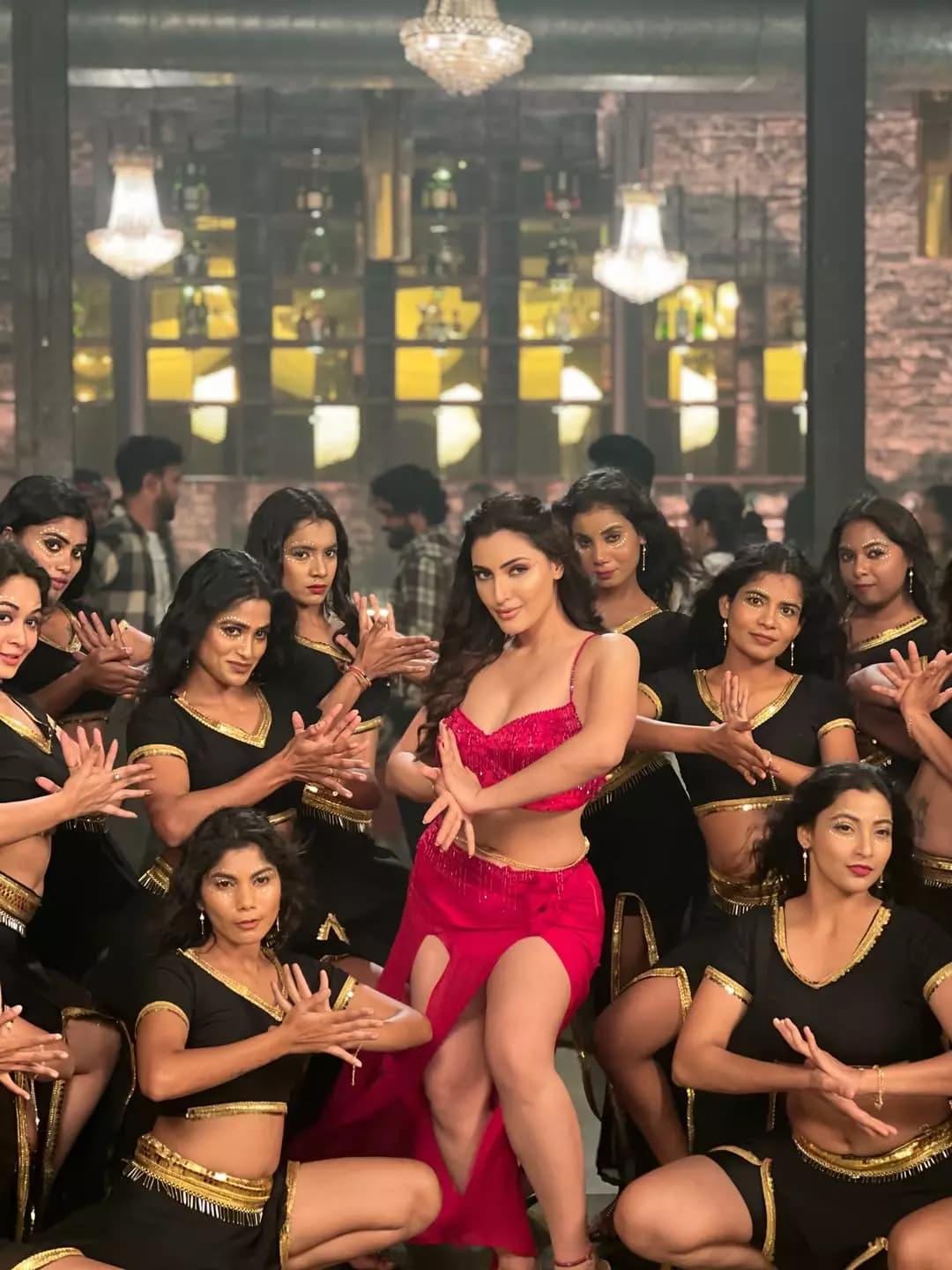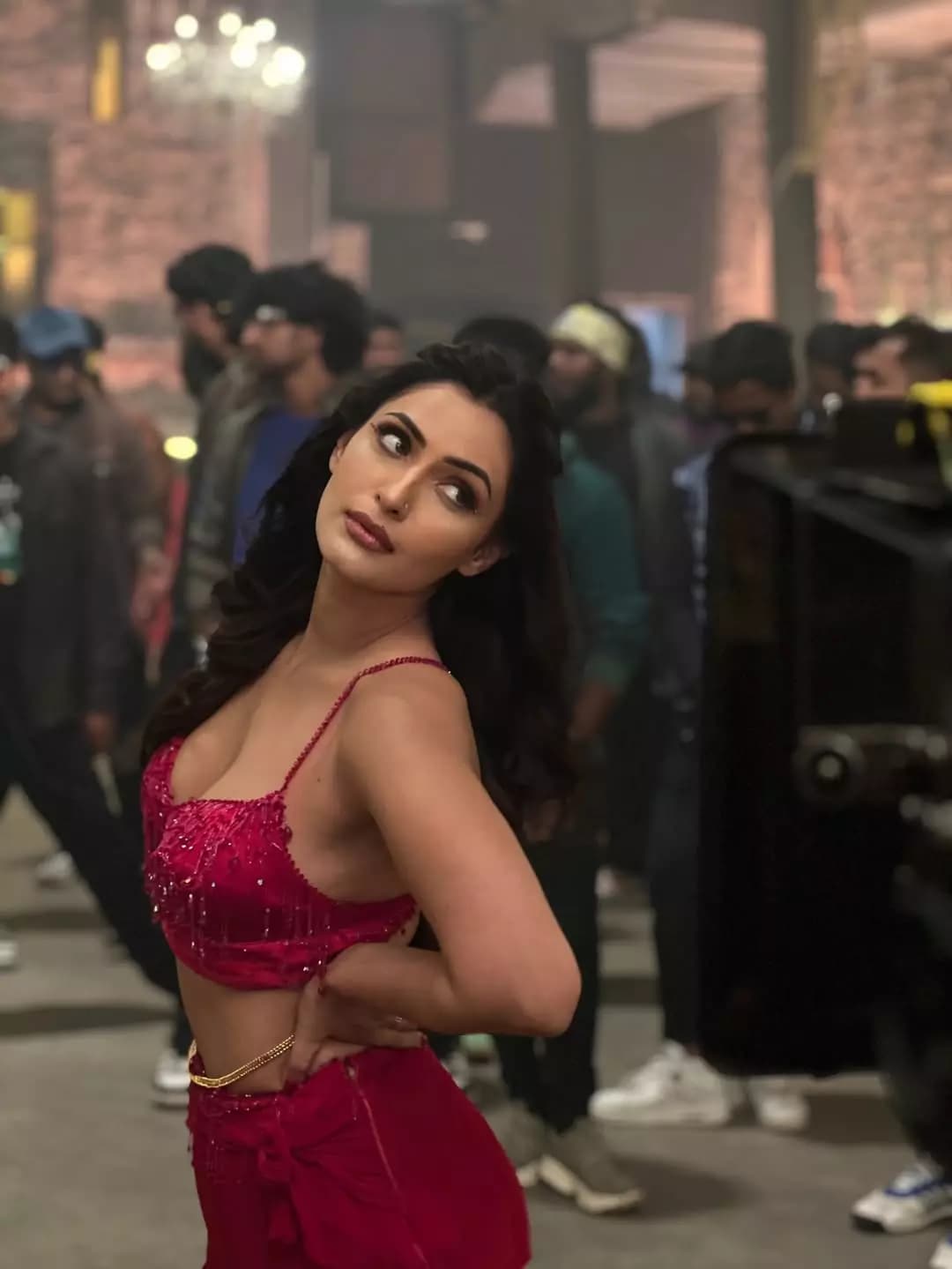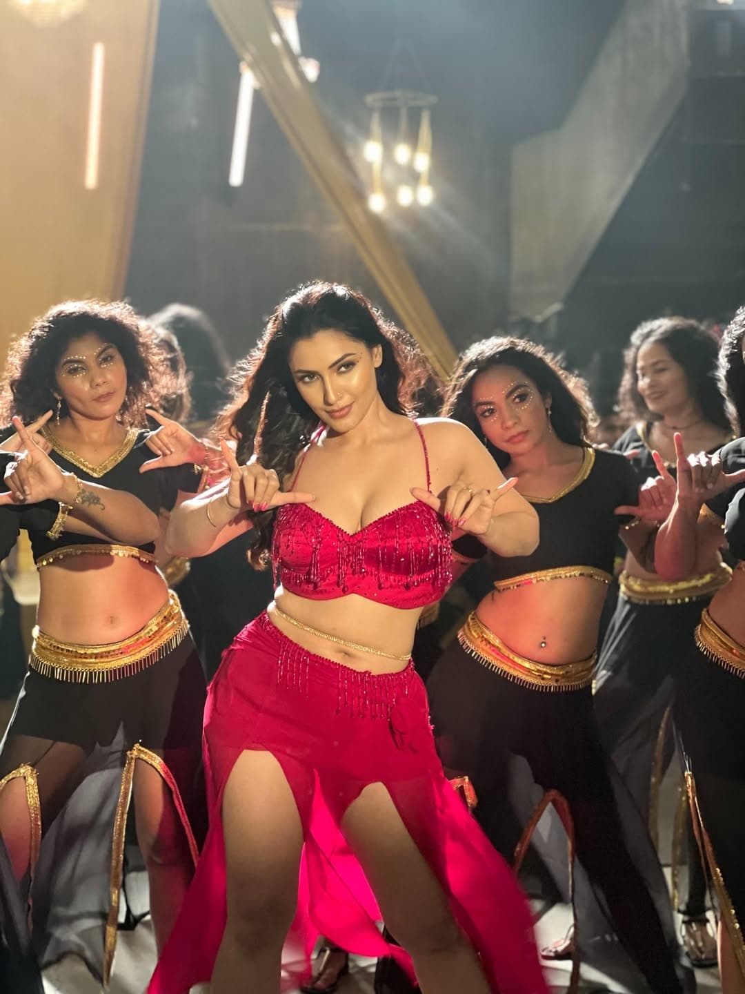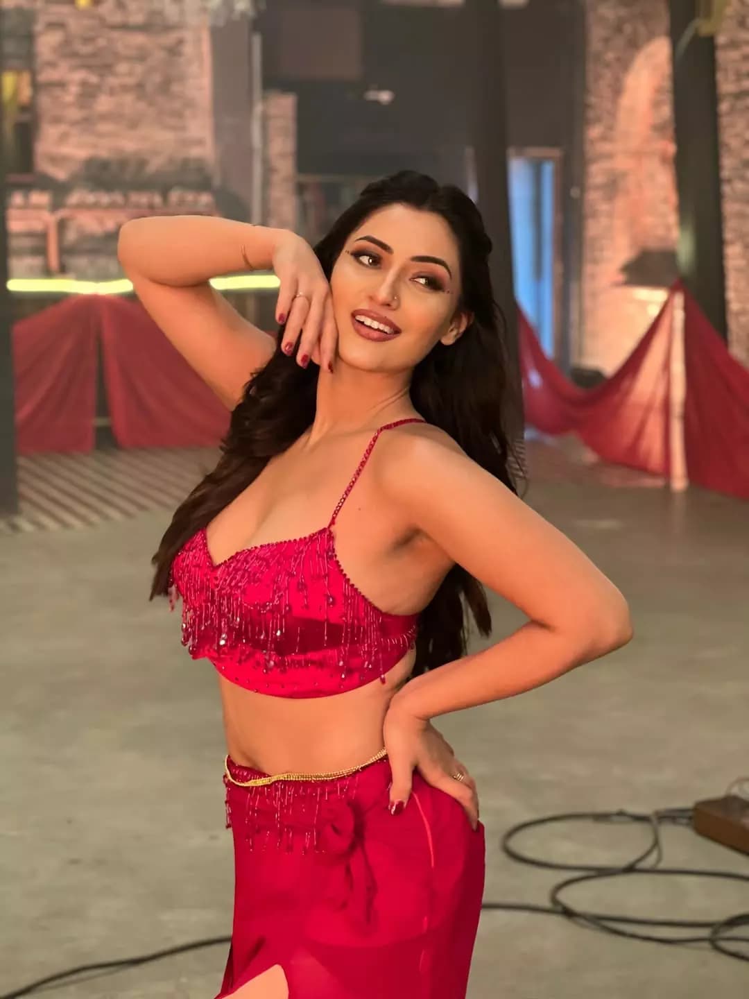 Shivangi Verma is trending on social media with her stylish red look from the Terror song. Dressed in a shimmering sequined bralette paired with a flowing draped skirt and a golden waist chain, her outfit delivers a complete glam vibe. She completed the look with sparkling heels, making it a striking modern fashion statement.