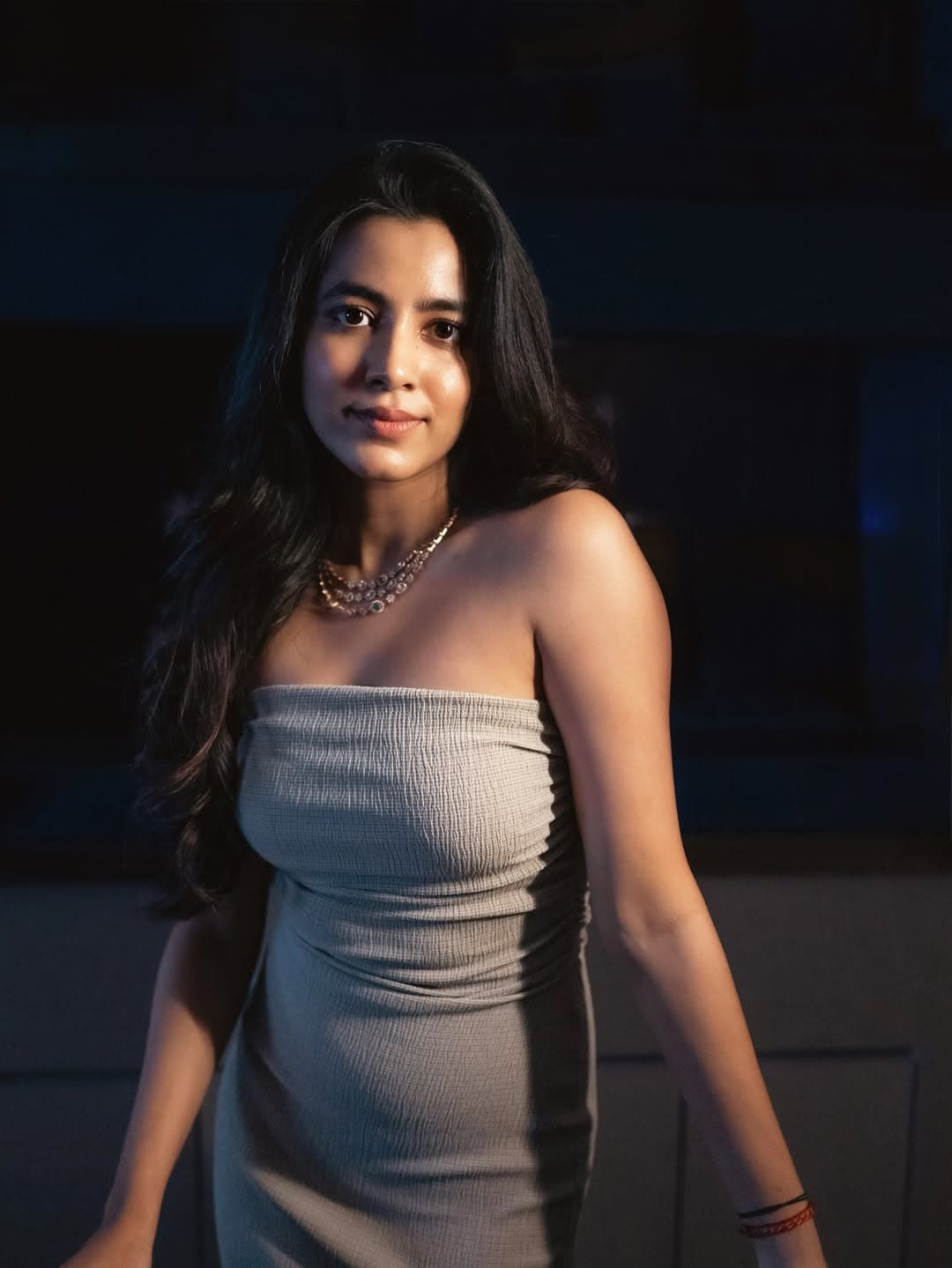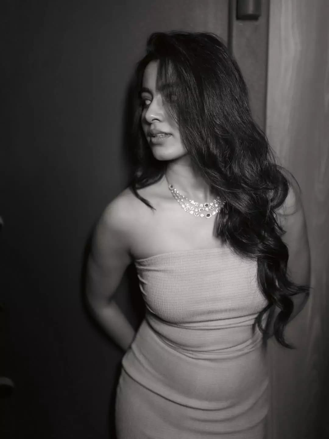 In the latest photo, Shivani Nagaram is seen wearing a strapless dress. The outfit highlights a clean and elegant look, fitting well with the black-and-white theme of the image. The dress gives a modern and stylish appearance without heavy detailing.