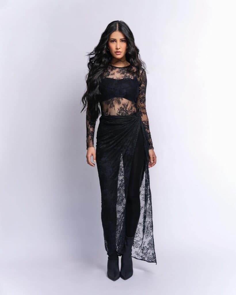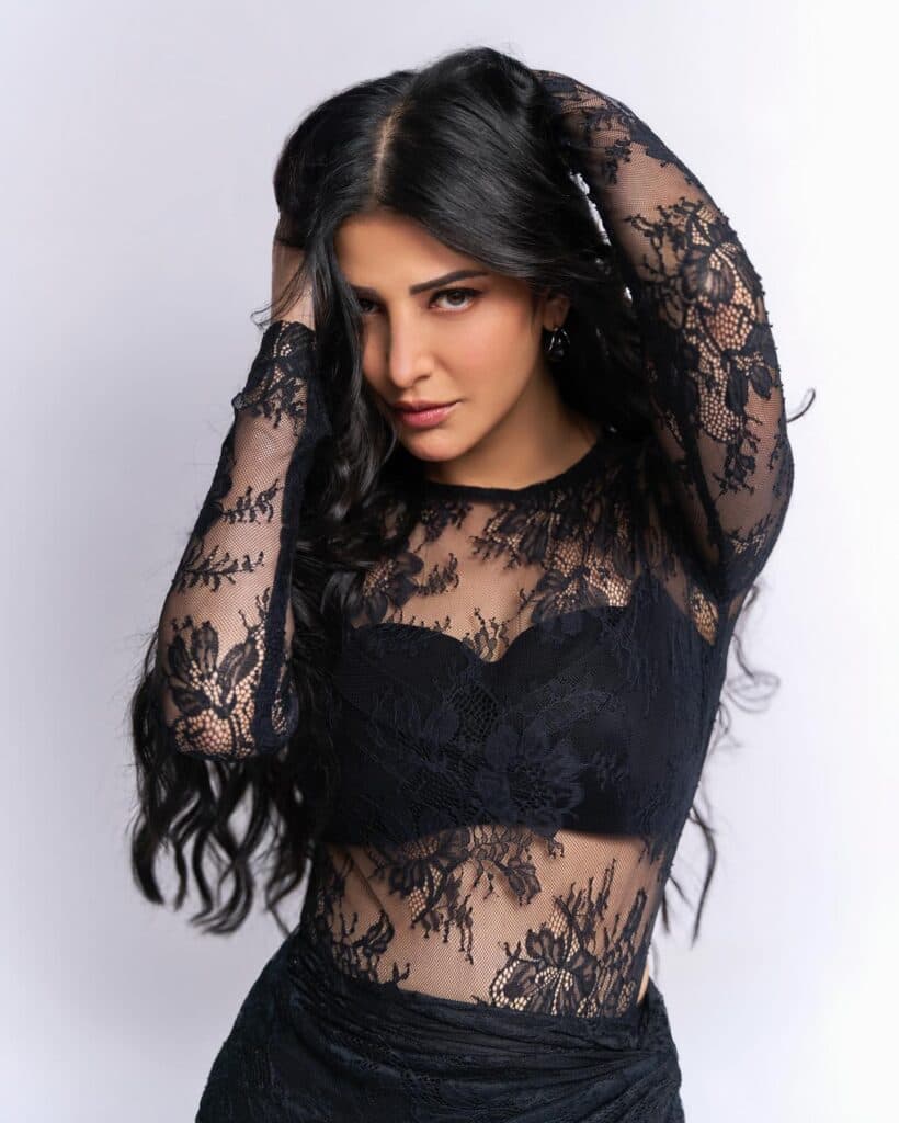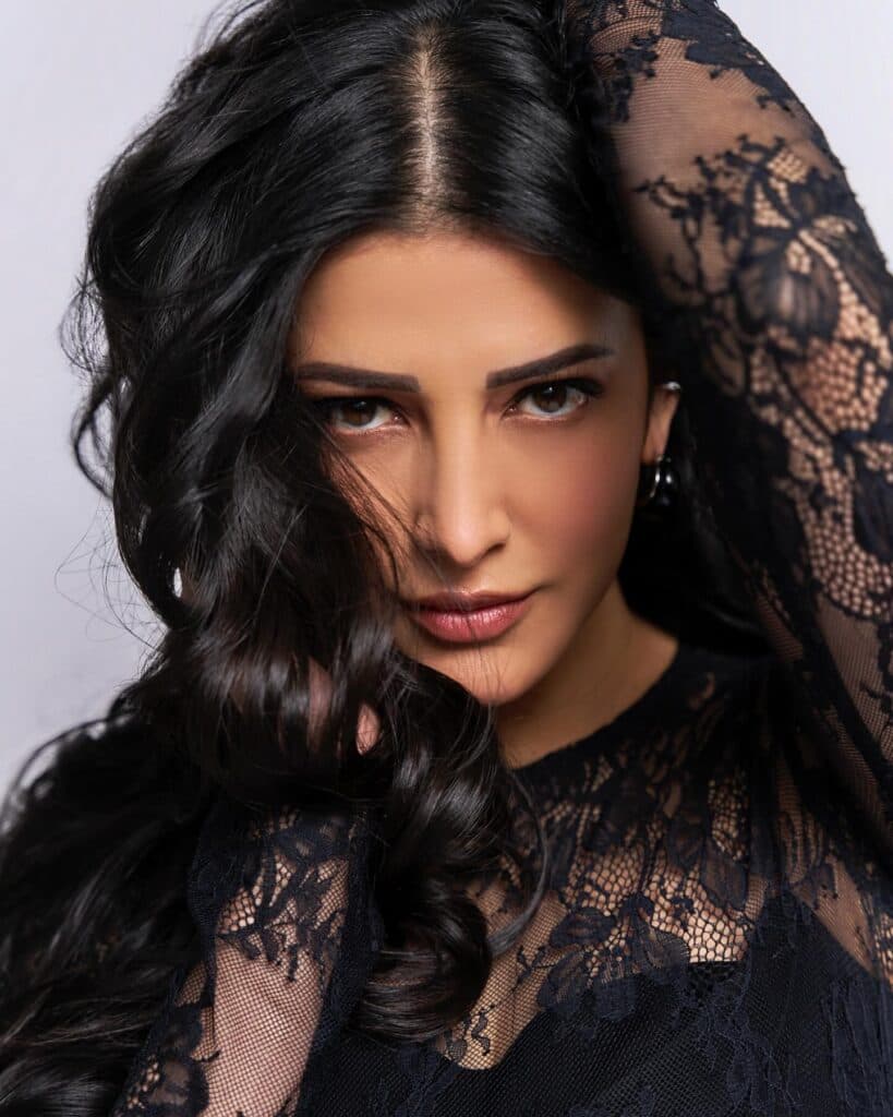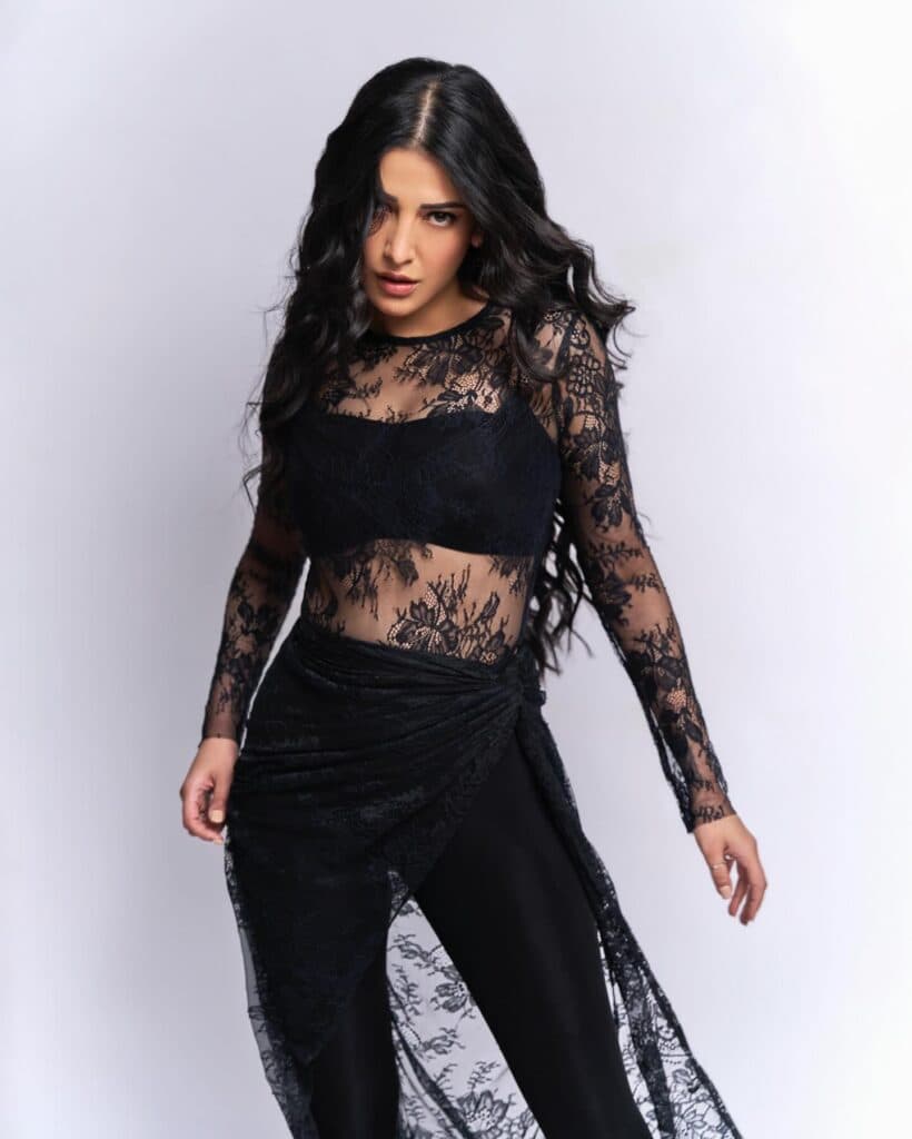 Shruti Haasan turns heads in a black bralette paired with matching pants and boots, highlighting her strong, confident style. The netted top with intricate leaf detailing adds a fierce yet elegant edge, making the entire outfit striking and unforgettable.