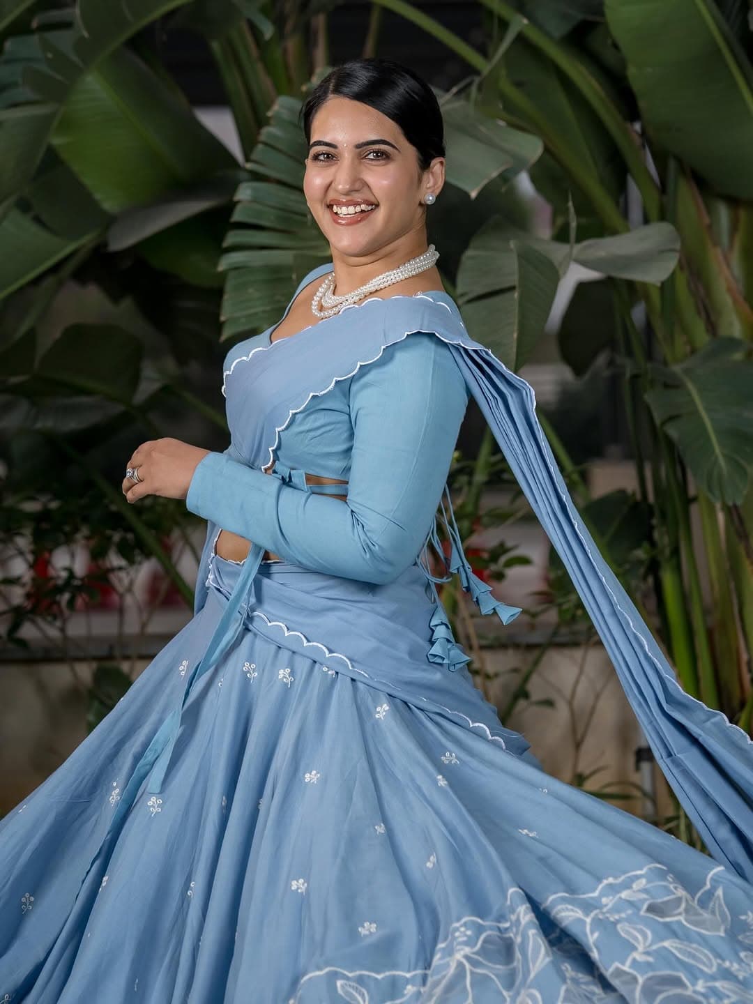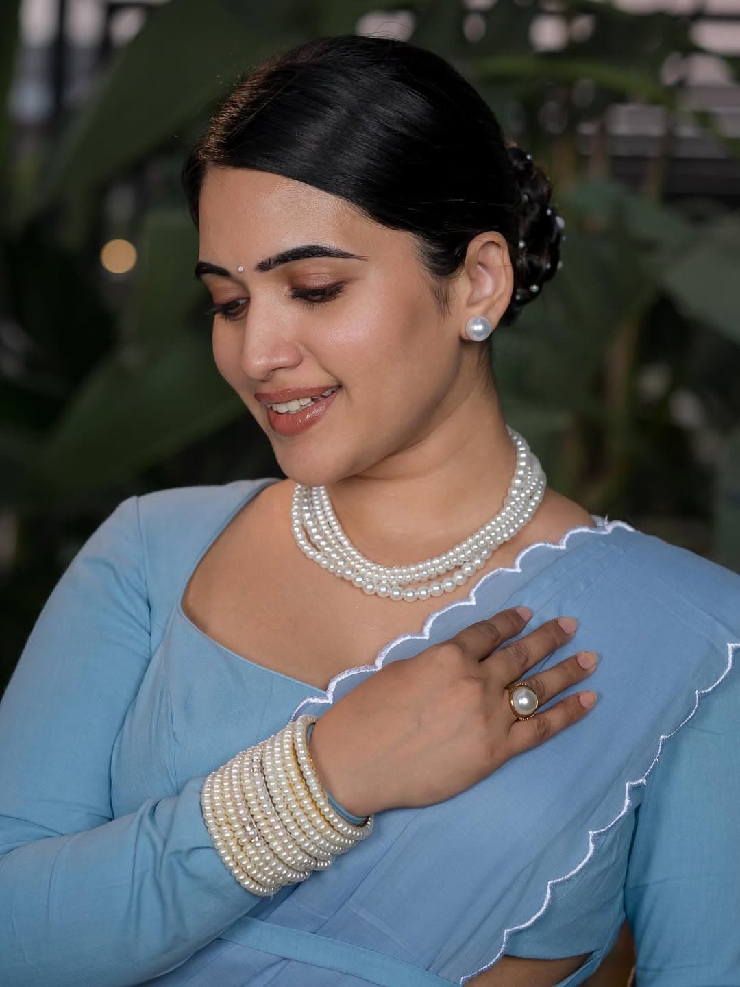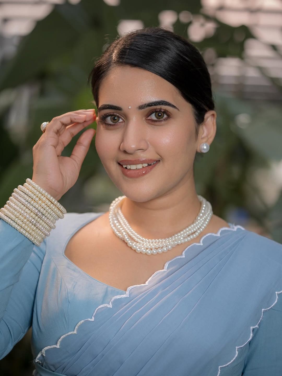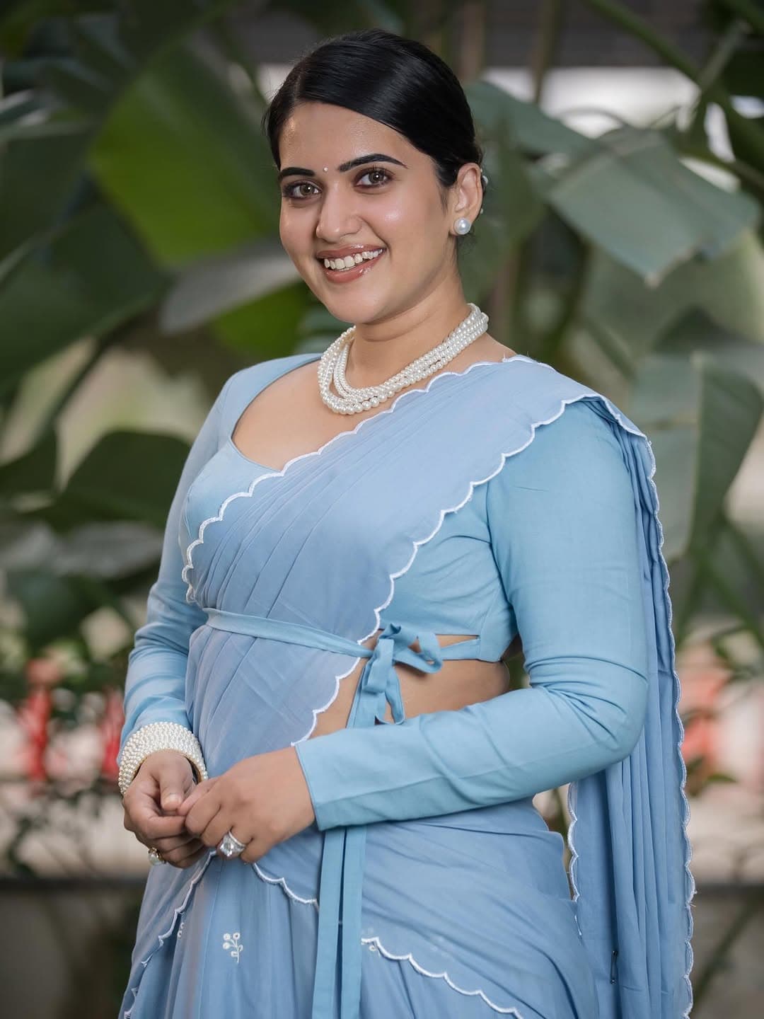 Sravanthi Chokarapu looks graceful and radiant in a soothing blue saree, perfectly complemented by pearl jewelry and a classic hairstyle. Her charming smile and elegant styling make this look effortlessly captivating.