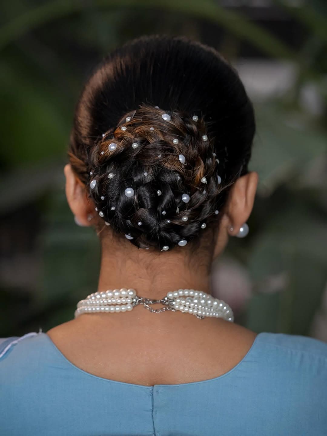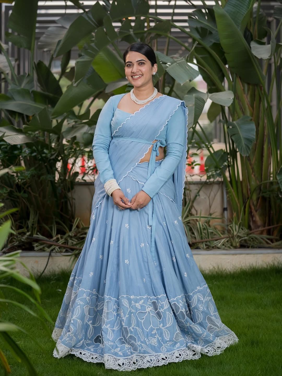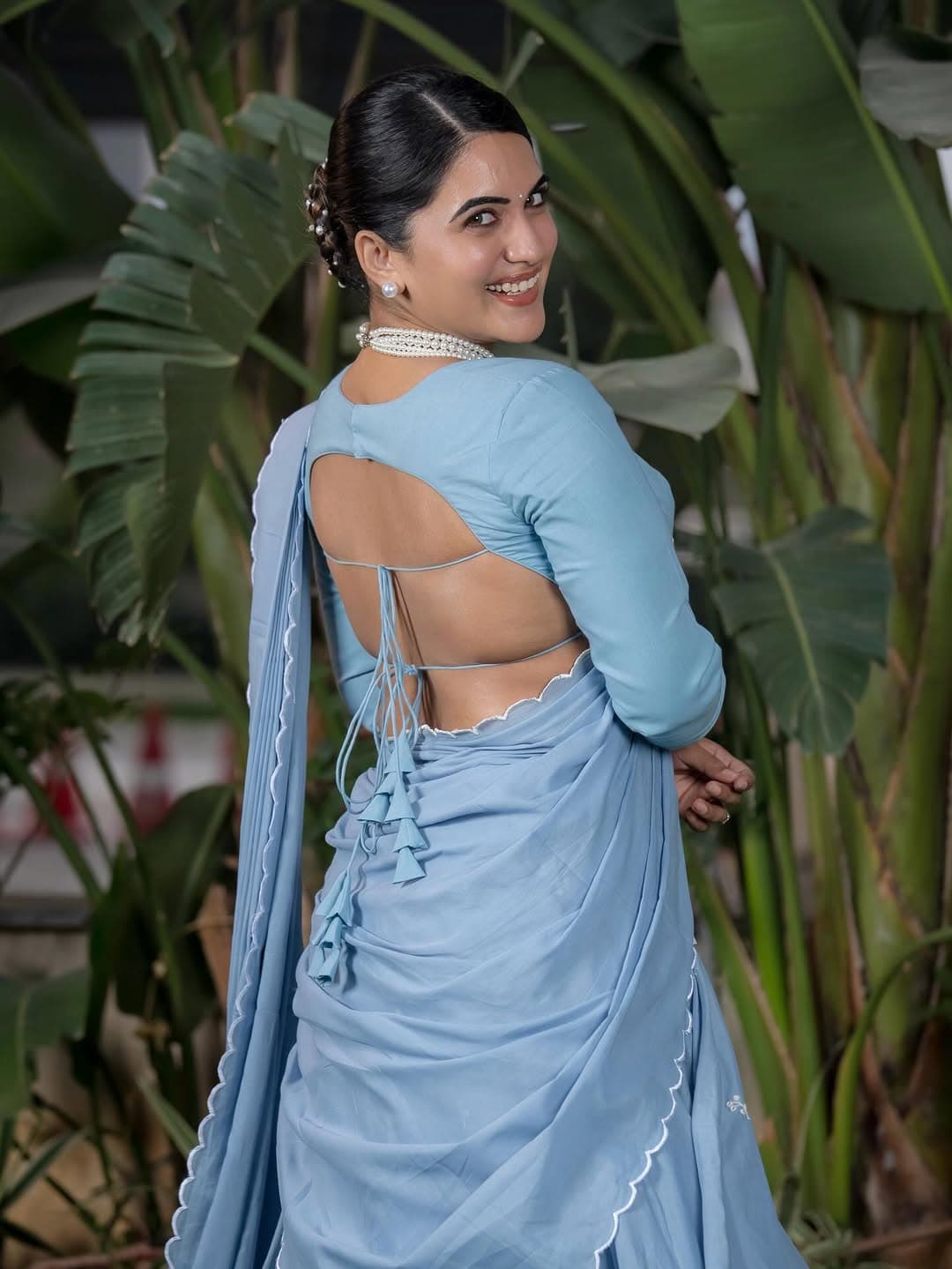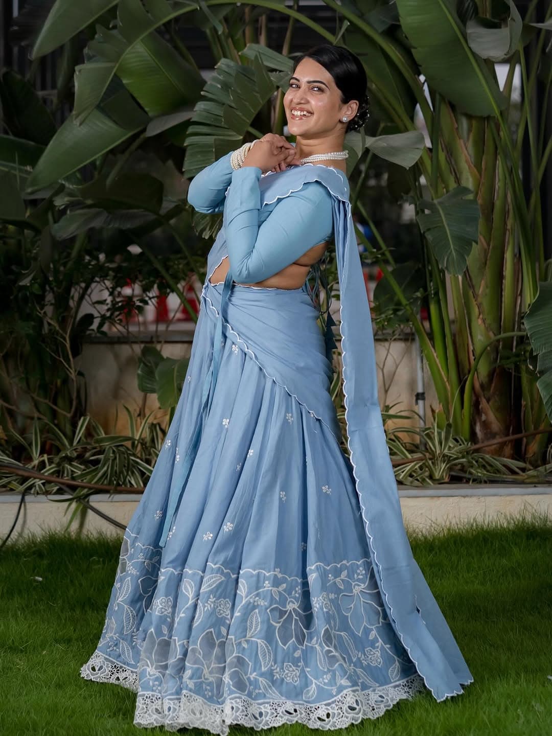 Sravanthi Chokarapu looks graceful and radiant in a soothing blue saree, perfectly complemented by pearl jewelry and a classic hairstyle. Her charming smile and elegant styling make this look effortlessly captivating.