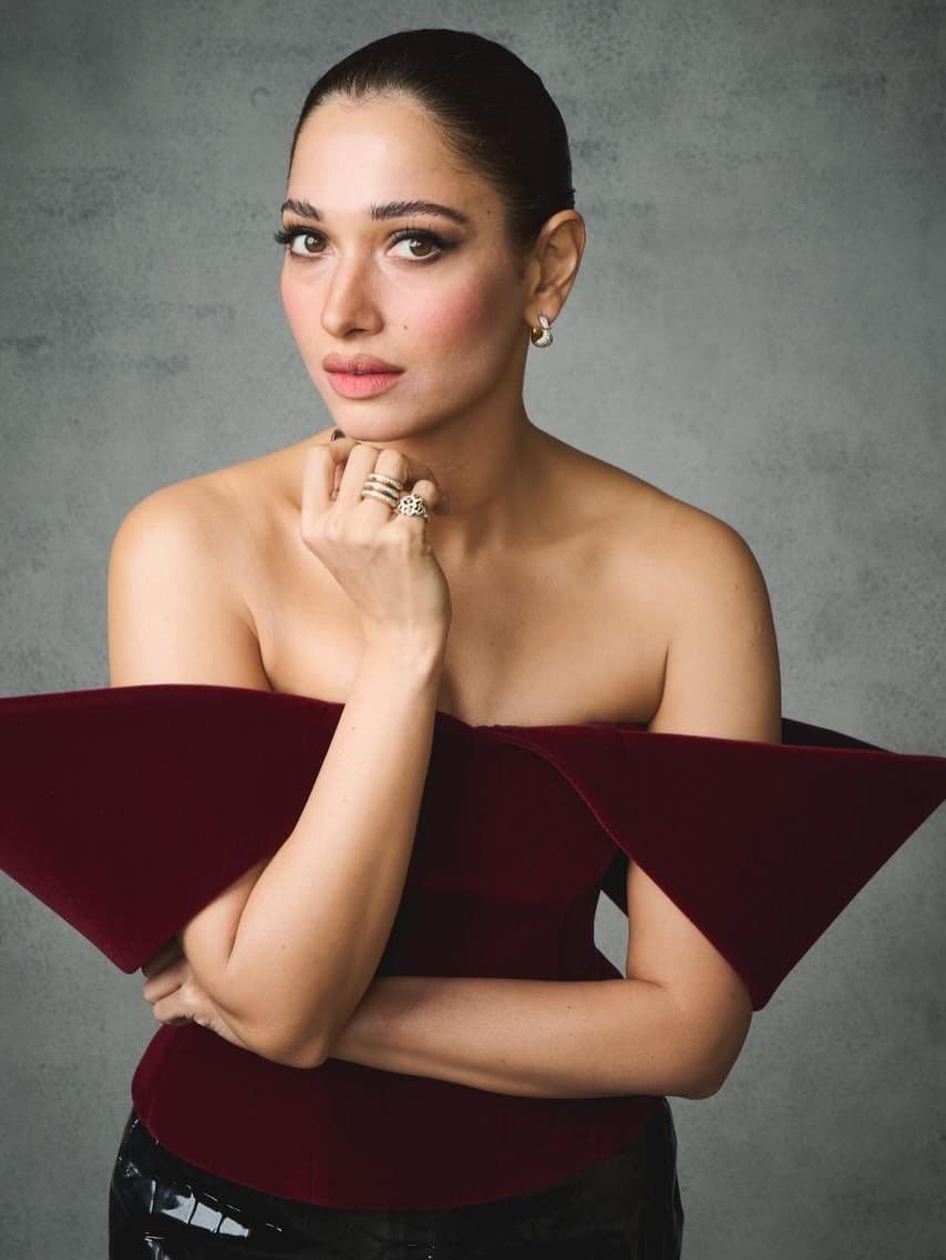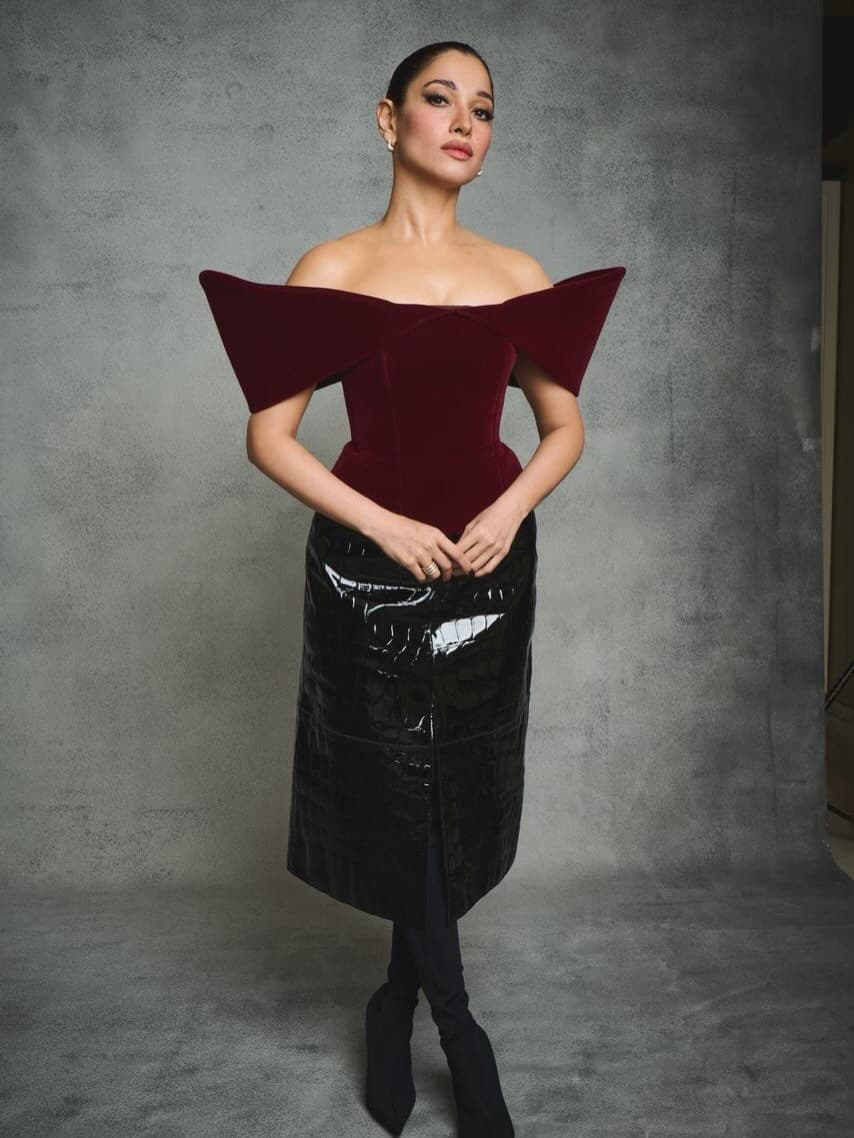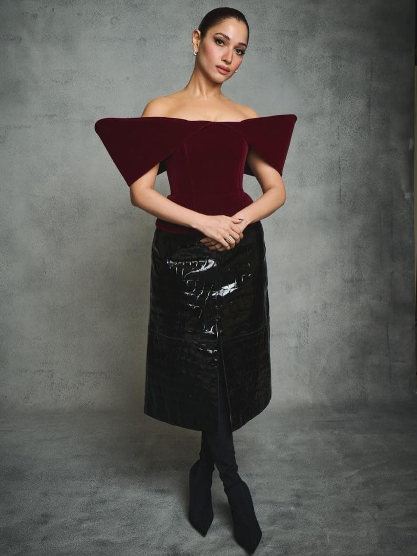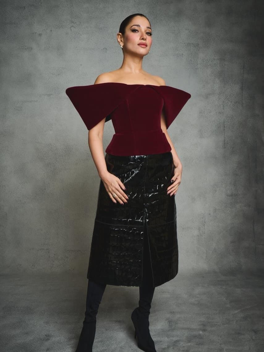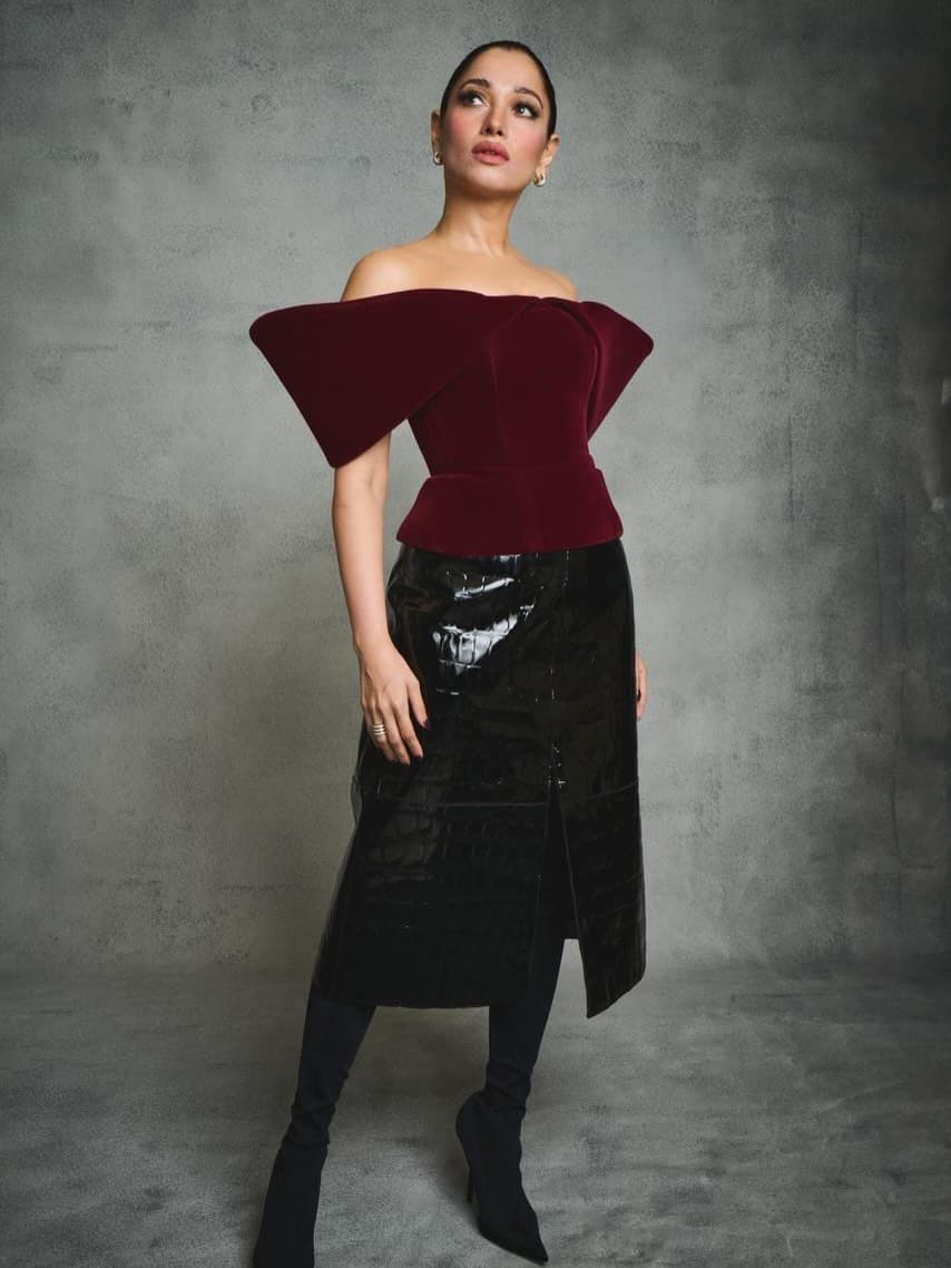 Tamannaah turns heads in a bold maroon and black ensemble, exuding confidence and elegance. Her poised styling and fierce attitude make this look a true fashion statement.