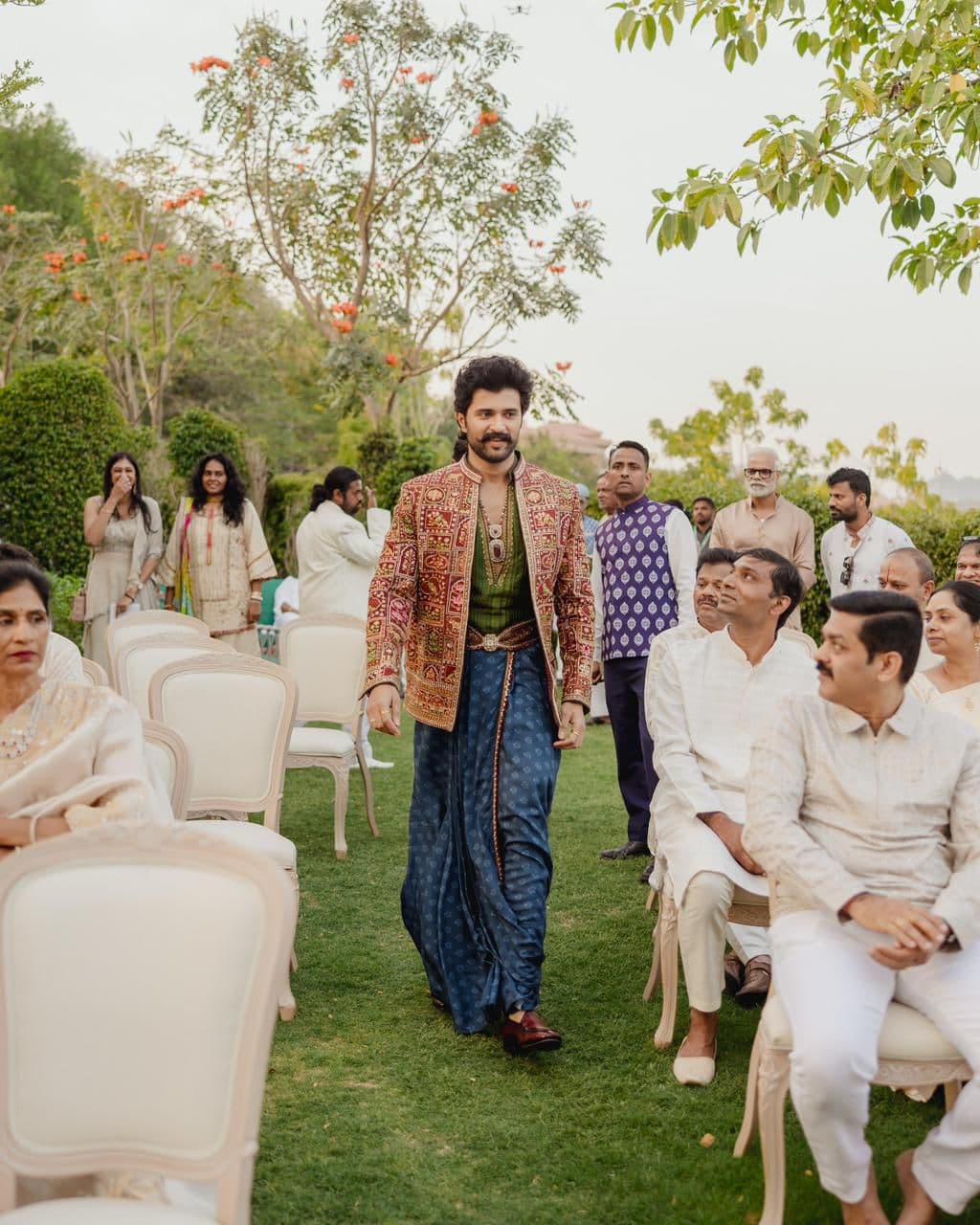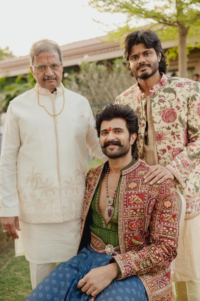 Vijay Deverakonda dazzled at his Pradhanam and Mehendi event with Rashmika, showcasing royal swag in his unique style. Their stylish appearances mesmerized fans, making this look a hot topic on social media.